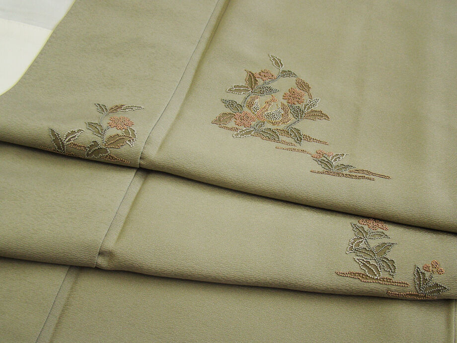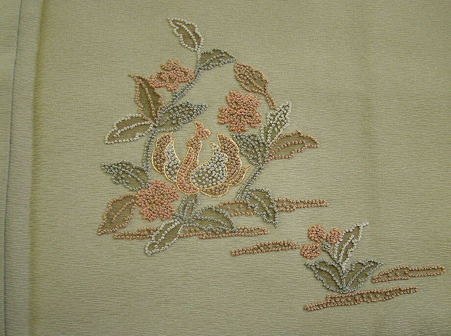 | 商品説明 | こちらのお品は「袷」でございますので、10月~5月にお召頂ければと思います。 しなやかで柔らかくぽってりとした手触りの着心地良い重めの極上ちりめん地の生地、 渋い薄い青白橡色地に花草柄等の精緻な手技を駆使した極め細やかな佐ヶ良刺繍柄、 お慶びのお席や今日を美しく愛でるかの様な装いを印象付ける 正統派のお着物として一枚は欲しい麗しいお着物です。 八掛はオリーブグリーン色(正絹)、身幅が広めです、幅広い年代の方にお召し頂けます。 |