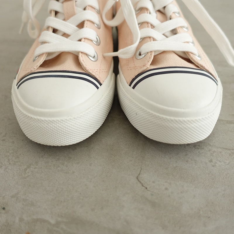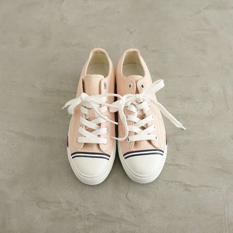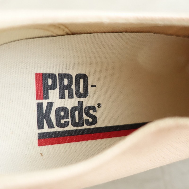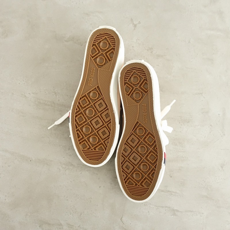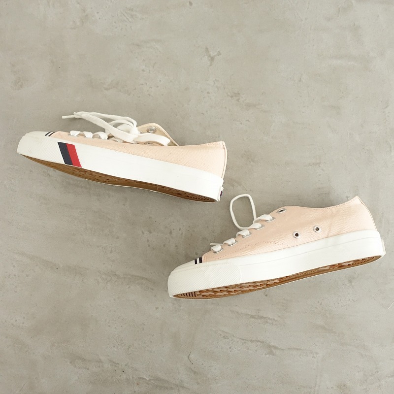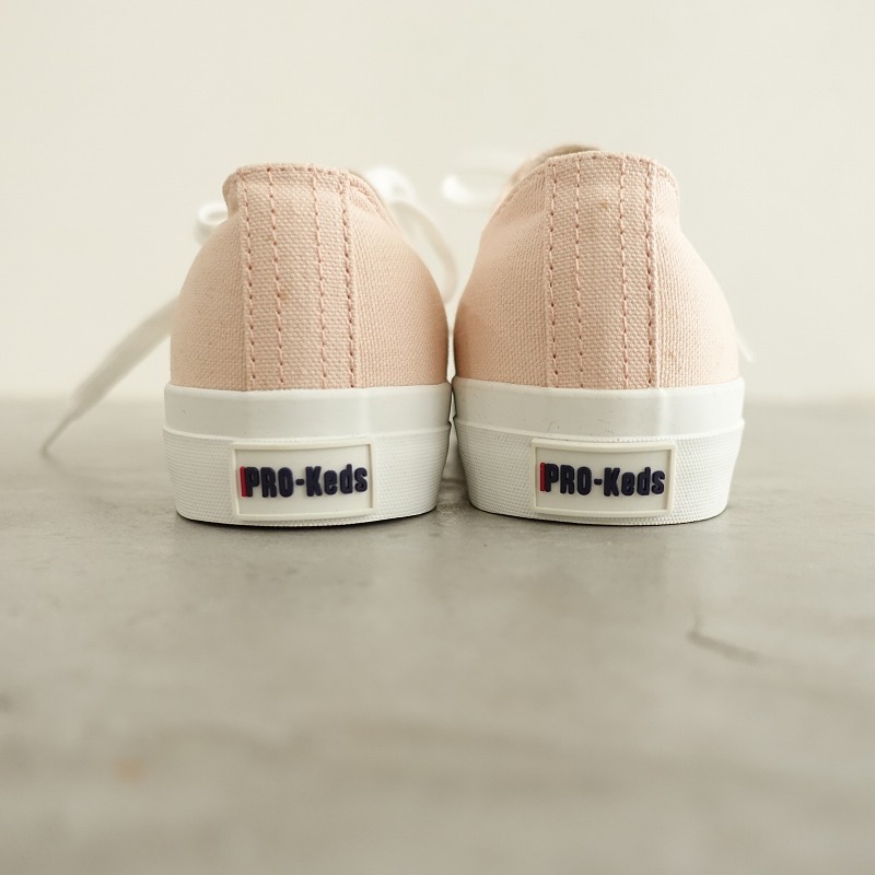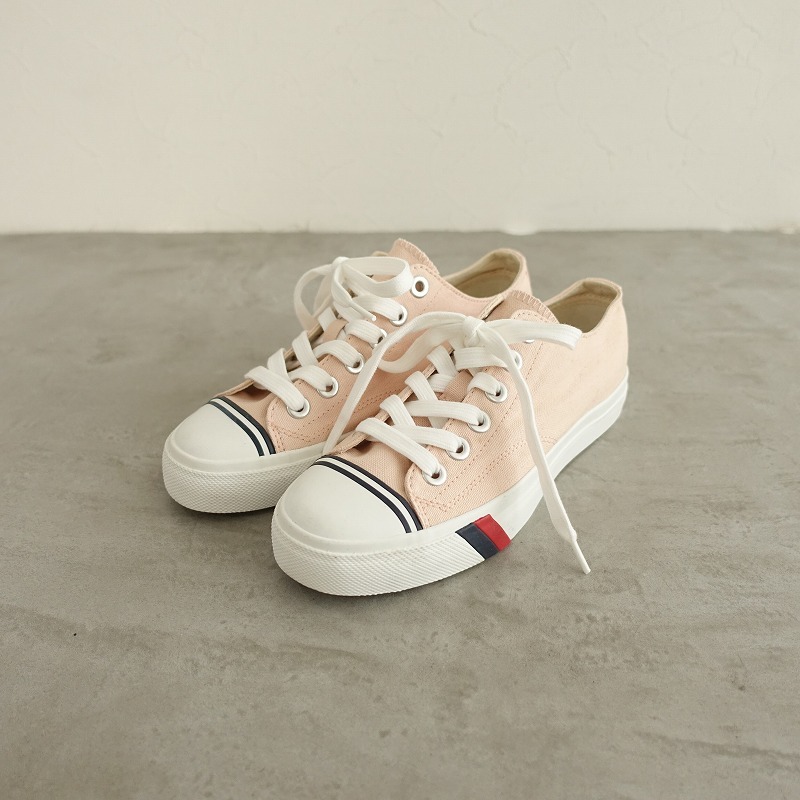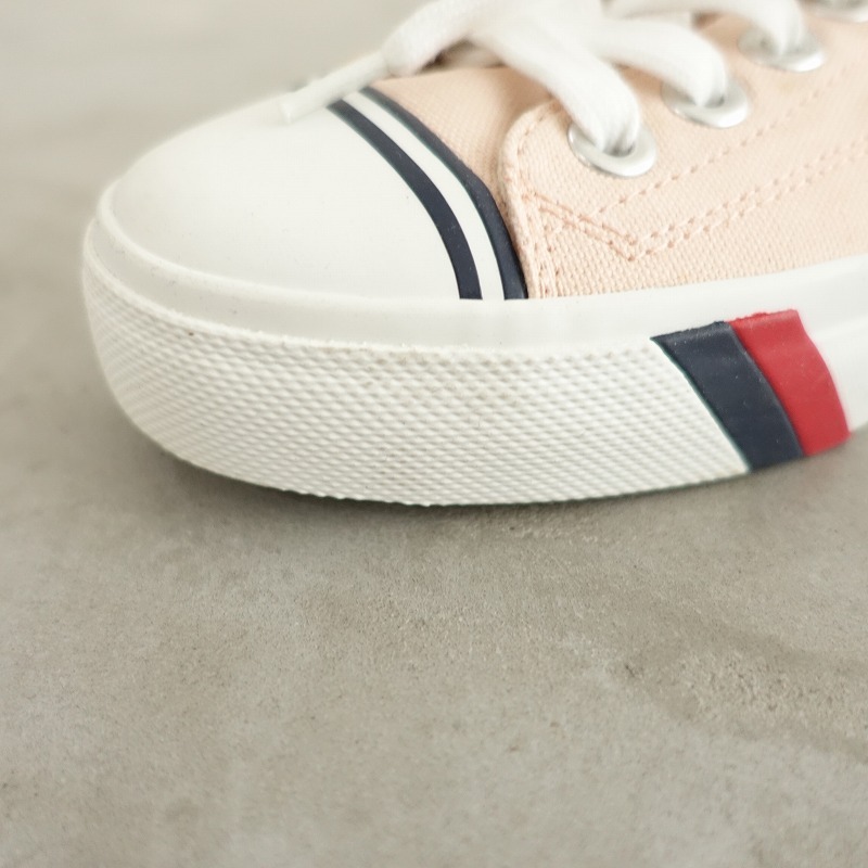 | PRO-Kedsのキャンバススニーカーです。カラーはピンクベージュのキャンバス地であしらわれており、トゥキャップが施されたデザインで、シューレースで着脱していただけ、クッション性のあるインソールは取り外し可能です。 |