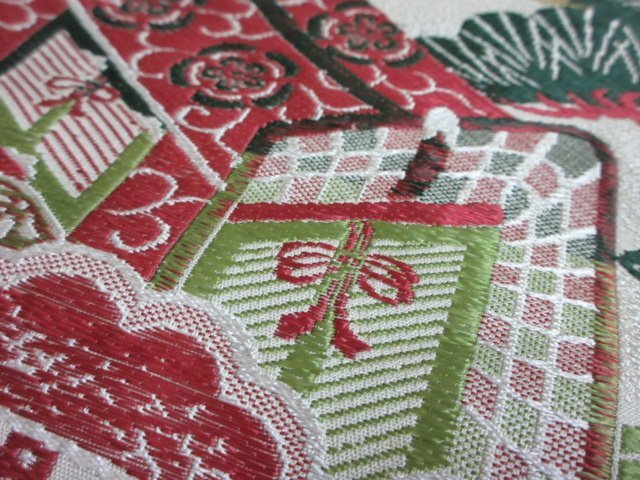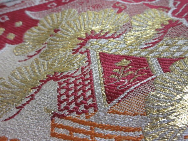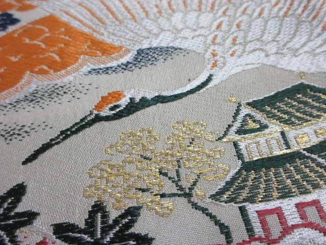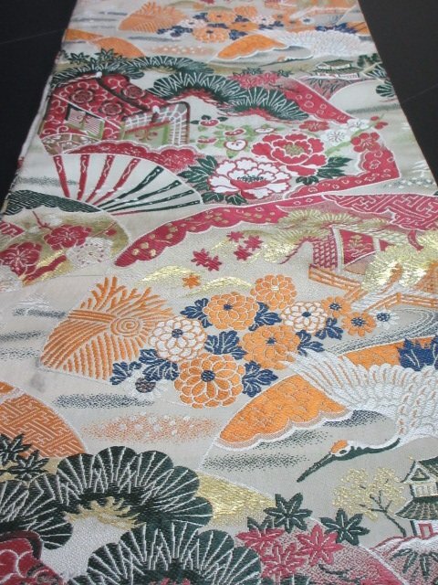 | 商品名 | 1円 中古 袋帯 正絹 和装 和服 リバーシブル 鶴 御所車 松 四季花 扇子 お洒落 全通柄 長さ385cm【夢職】★ |