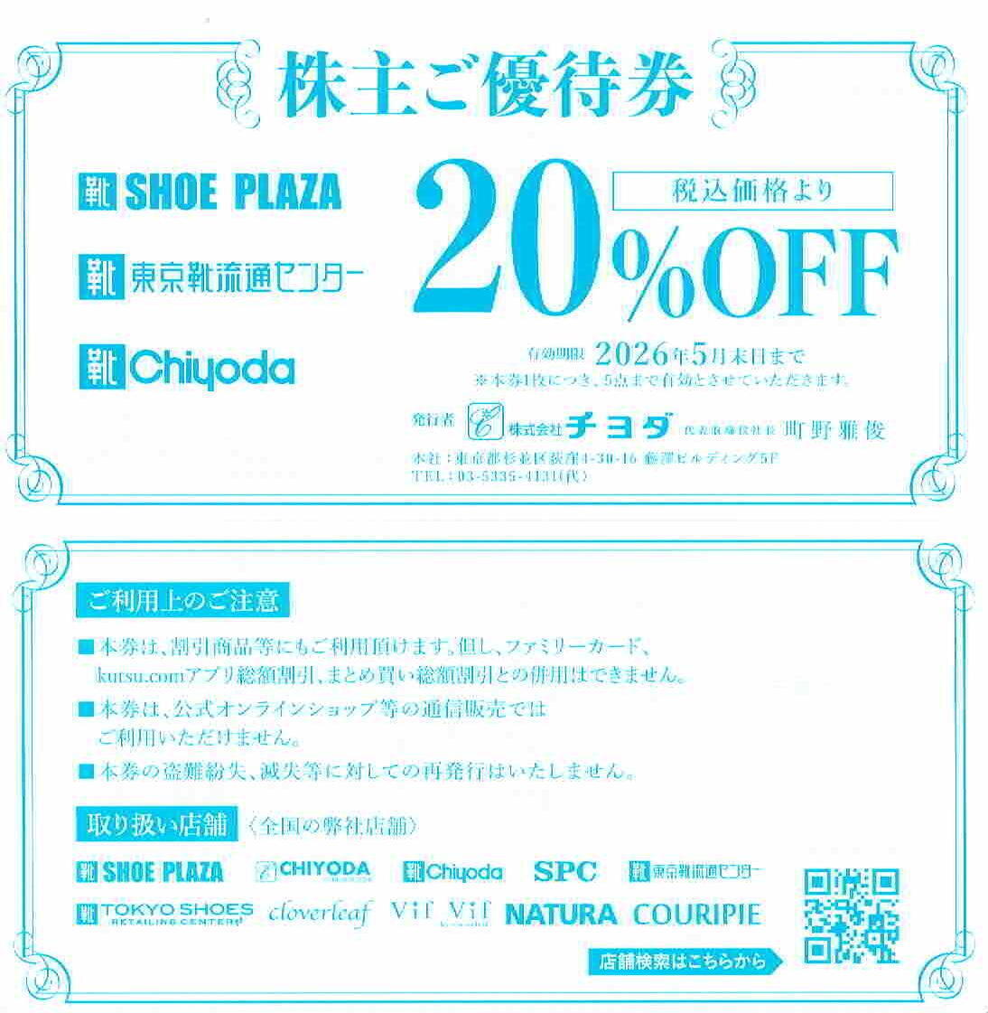 【 商品説明 】 チヨダの株主優待券です。 全国のSHOE-PLAZA、東京靴流通センター、チヨダ店舗にて、 お買い物の際に本券使用で20%offとなります。 | 出价者 | 信用 | 价格 | 时间 |