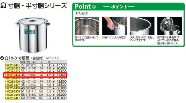 | 商品名 | 18-8ステンレス寸胴鍋(目盛付) 36cm | |