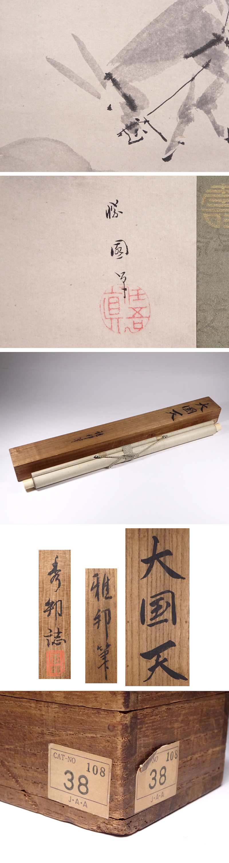 江戸木挽町狩野派9代狩野勝川院雅信に師事して伝統の狩野派を修め、さらにはフェノロサから知遇を得て西洋画の技法を含んだ新画法を模索し、従来の狩野派に洋風の解釈を取り入れて新しい狩野派を再構築して名実ともに明治期の日本画壇の頂点に君臨した【橋本雅邦】(1835-1908)筆。     紙本淡彩「大黒天」です。     構図・筆致・彩色共に大変バランスのとれた素晴らしい作品です。     氏の三男で画家【橋本秀邦】(1881-不明)による極箱付き。     表装の一部破れやシミ、本紙のシミなど相応に経年感はありますが、その他に致命的な傷みは無く総じて良好な状態です。