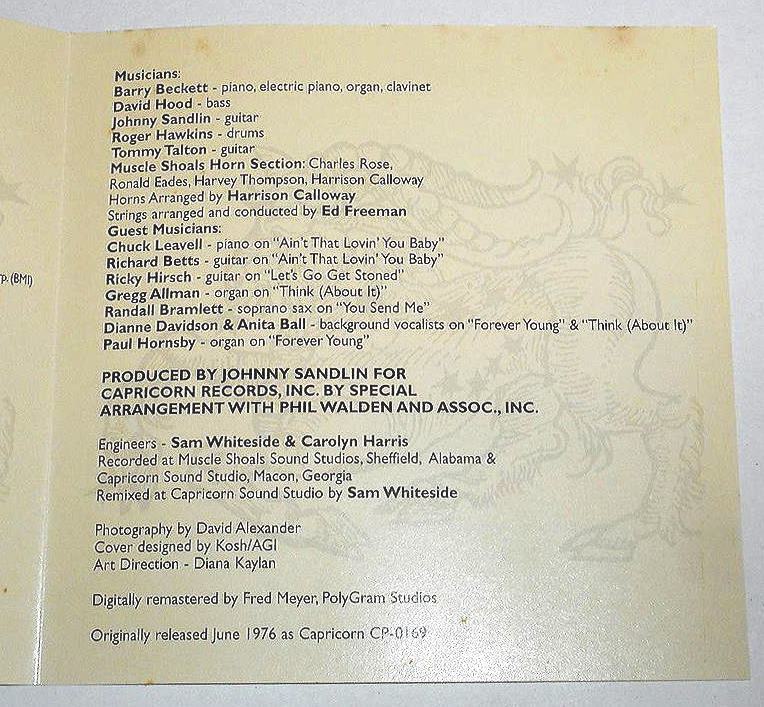 オールマン・ブラザーズのメンバーがバッキングで参加、1曲目でグレッグ・オールマンがオルガン、8曲目でデッキ―ベッツがギター、7、8欲目でチャック・リーヴェルがピアノを弾いている模様