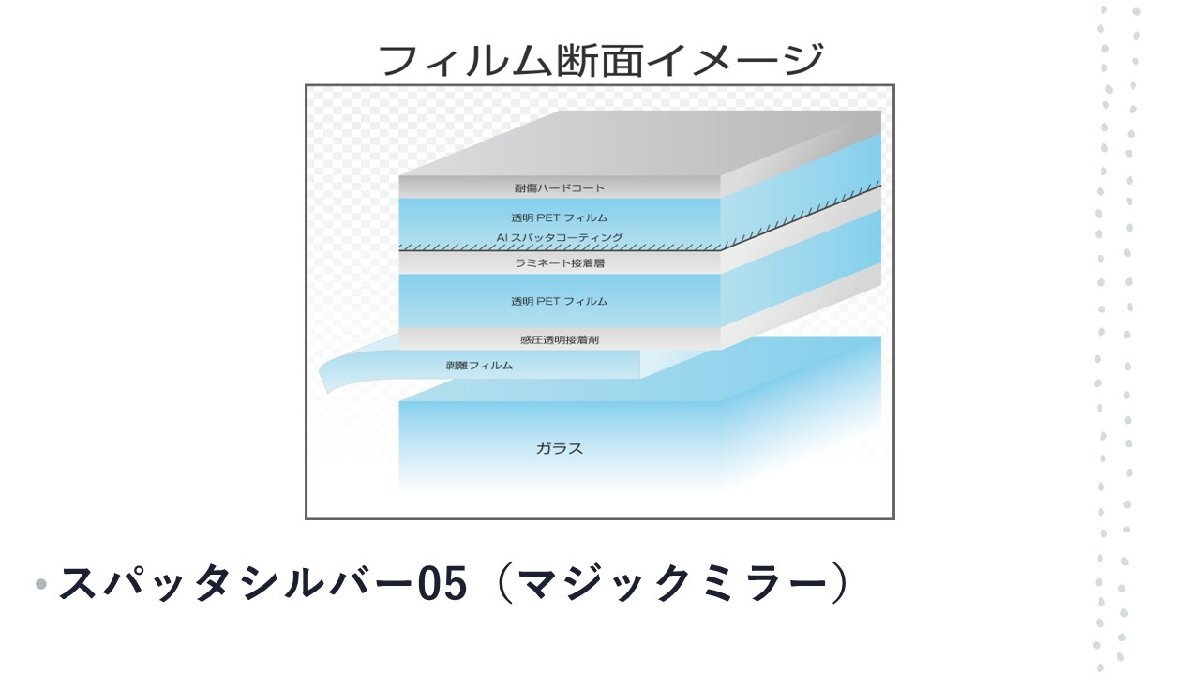 アルミ蒸着タイプに比べ、よりリアルな反射(マジックミラー)をし、 耐久性・精度に優れます。