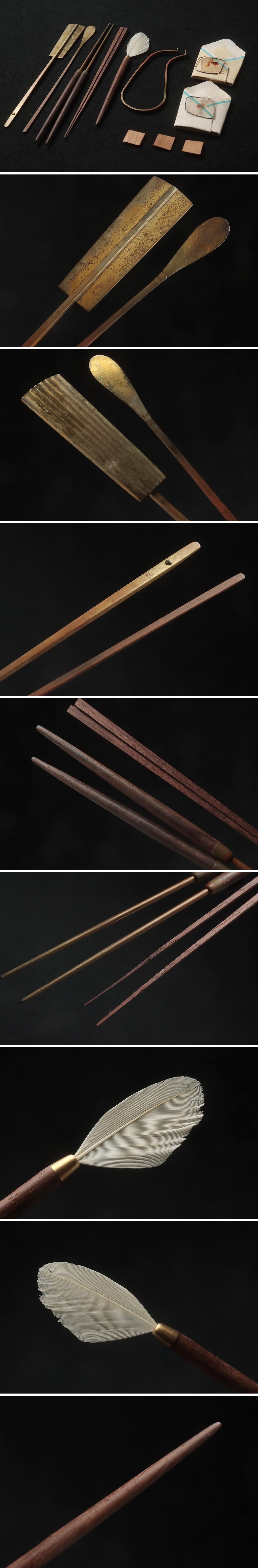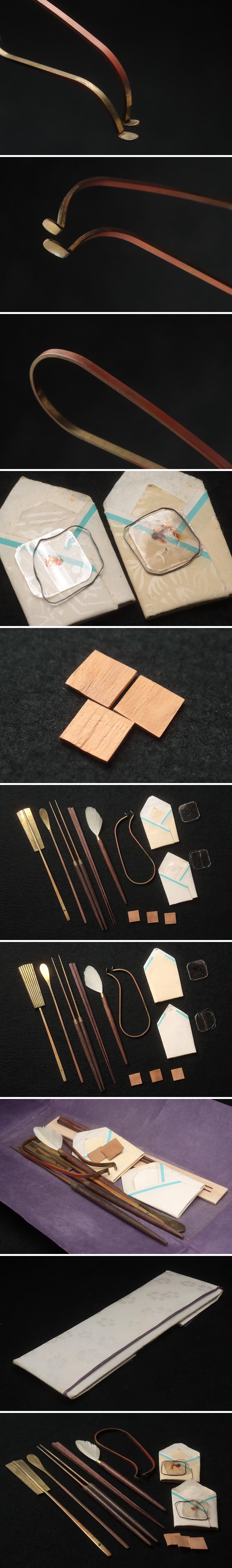 | ◆ 時代 火道具 香道具 黄銅/桑製 七つ道具 一式 畳紙付(火箸/香箸/香匙/灰押/銀葉挟/羽箒/角割香木) ◆