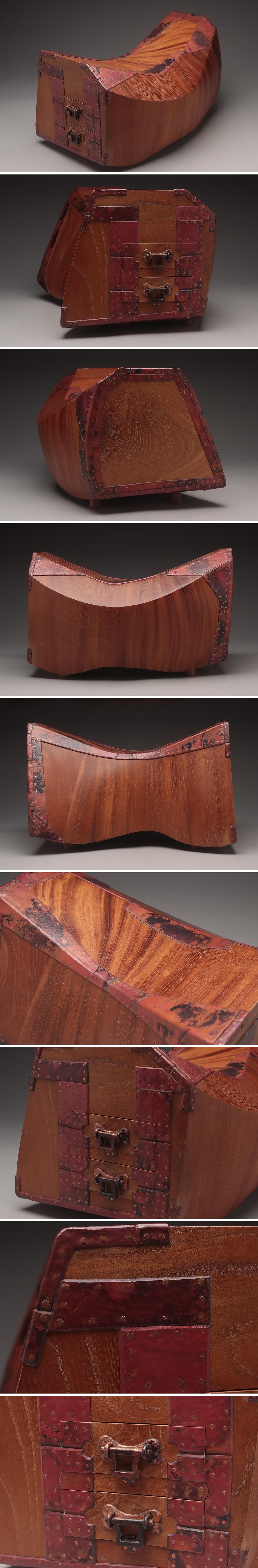 | ◆ 【小家 弘誠 作】重厚 木造 美杢 小引出「笑」奥行38cm / 重10.3kg・脚付銭函形小引出 日本伝統工芸 木工芸 ◆