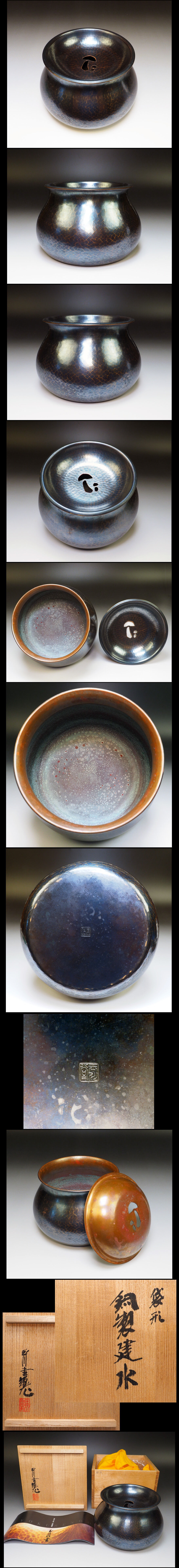 ![]() 玉川堂の鎚肌「銅製建水」です。 印銘あり サイズ:約 径 15cm 高 9.6cm 共箱・栞付 作品状態:使用による擦り傷、変色、腐食よごれがあります。(目視確認です。) 詳細は写真でご判断下さい。 状態による返品はお受けできませんので予めご了承ください。 細かな点が気になる方、神経質な方のご入札をお控えください。 画像・説明ををよくご覧いただき、ご判断くださいますようお願いいたします。 不明な点は、入札前に質問等でご確認下さい。 | |||