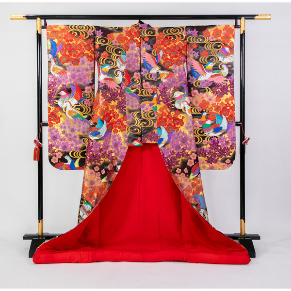 貸衣装処分品の色打掛です。 結婚式に使用できます。素材は正絹です。 寸法は袖丈105cm、裄66cm、丈182cmです。 商品のお問い合わせ、試着来店希望の人は 075-221ー5829(平日9時~18時)北川に遠慮なくお電話ください