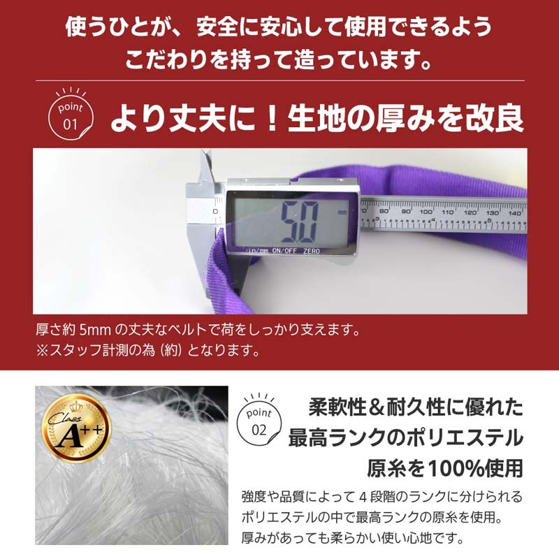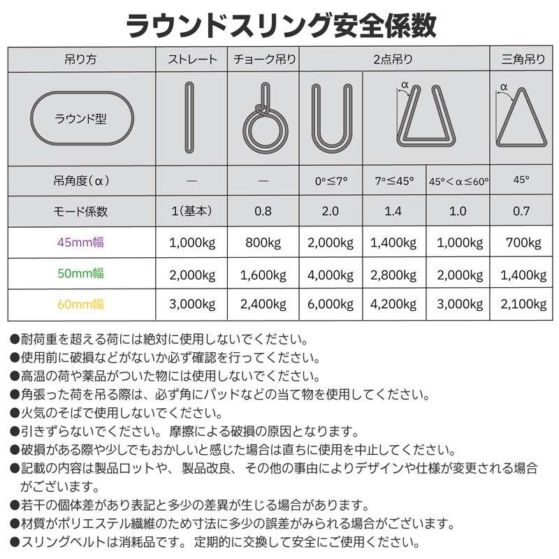 | ピアノ・オルガン・家具・庭石・植木庭木・石材加工品・墓石・彫刻作品などの吊り上げ・移動・運送・運搬、山林業や果樹園での原木搬出・抜根・杭抜作業、景石・柱石・ヒューム管などの据付作業。 ソフトスリングのように柔らかくベルトスリングより幅広で、優しくしっかりと安定した作業が可能なエンドレススリングです。 ・ベルトサイズ:幅45mm×長さ2m(全周囲4m) ・最大使用荷重:ストレート吊1000kg、チョーク吊800kg ※安全係数7:最大使用荷重×7=破断荷重 ・材質:ポリエステル100% ・製造国:中国 ・PL保険加入商品、欧州CE規格+GS&TUVマーク取得商品 ※商品改良の為、仕様・外観は予告なく変更する場合があります。 |