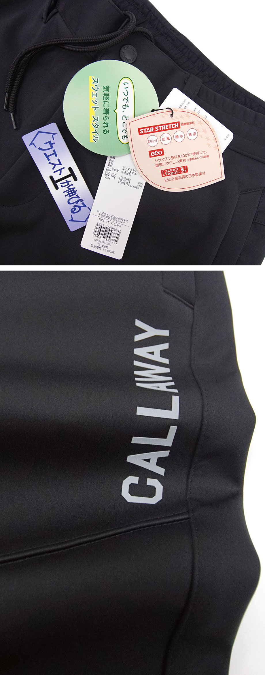 ●リサイクル原料を使用したキャロウェイオリジナル素材「スターストレッチeco」日本でエコ素材の開発を共に取り組み、登場したこだわり高品質・安心の日本素材。(環境にやさしいリサイクル繊維を100%使用したサステナブル素材を使用しています。)
