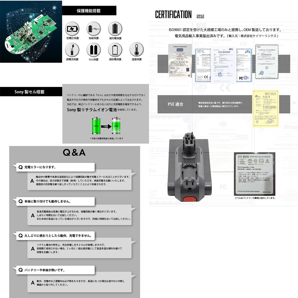 型番:V11-SV15 種類:リチウムイオン電池 認証:PSE・CEマーク取得済 容量:4000mAh 安心のSonyセル搭載!! 保護回路・過電流保護・過充電防止・過放電防止機能は純正品と同様に内蔵されています。 商品到着後1ヶ月以内にレビューご記入で長期保証1年間! |