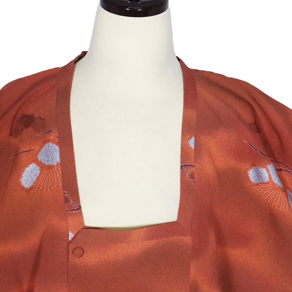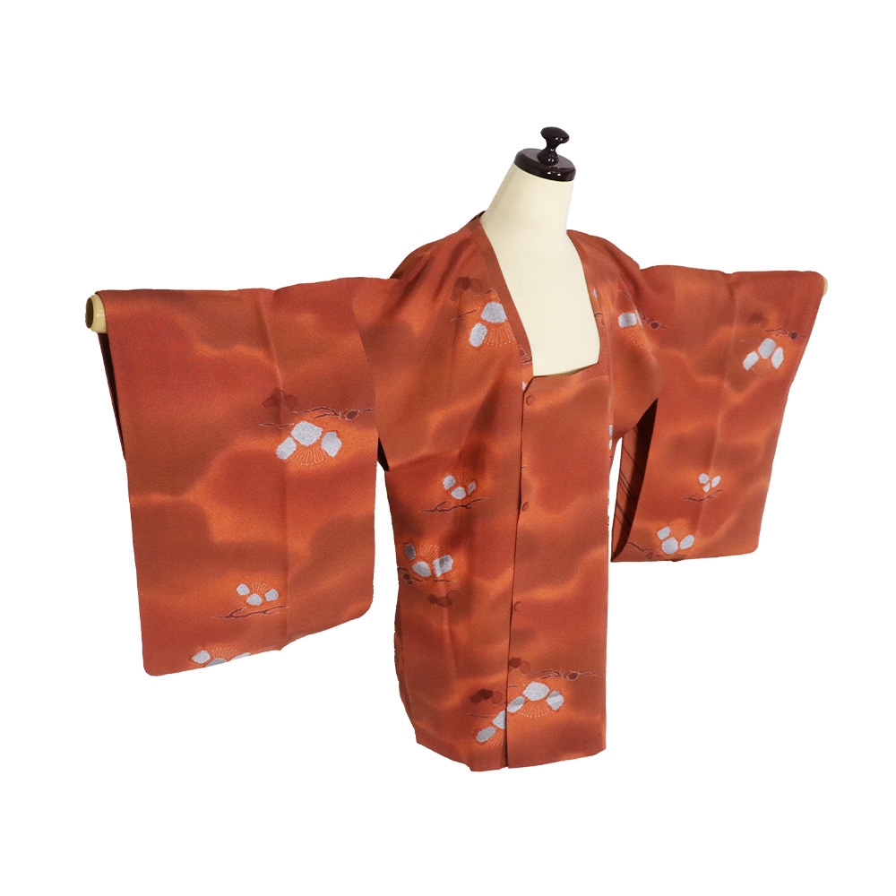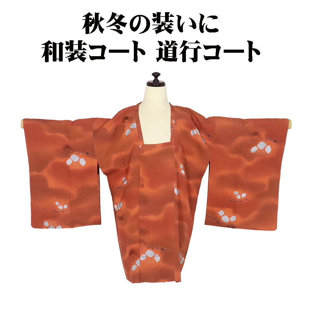 | 色・柄 | 秋・冬用 和装コート ト 道行コート 袷 赤茶・橙色・暈し地 一部絞り・松 (写真では上手く色が出ない場合があります。ご了承下さい) |
