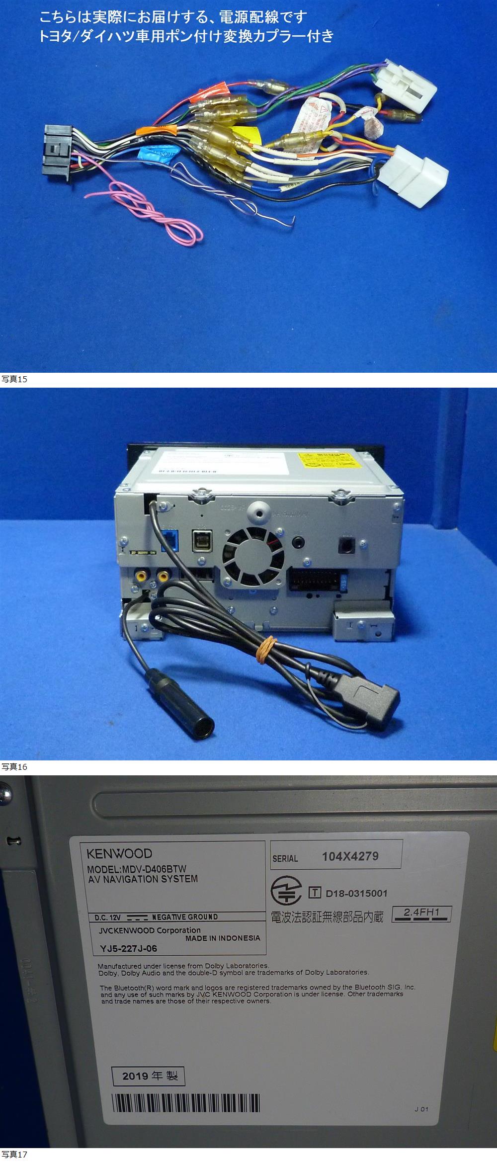 | 商品紹介 | ★★★地図データ最新版に更新済★★★ 地図データ 最新版・2025年秋9月リリース(2025年01版) ファームウェア 最新版 (4.0.4619.5600) 開通予定情報 最新版 (2026年第01月版) メモリーナビ SDナビ KENWOOD ケンウッド MDV-D406BTW 2019年製 シリアルNO.104X4279 画面サイズ 7V型ワイド 156.6(幅)×81.6(高さ)×176.6(対角)mm 外形寸法 横206mm縦104mm奥行174mm 埋込寸法 横178mm縦100mm奥行160mm 緻密で鮮やかな色彩表現を実現した高精細WVGA液晶モニターを搭載 7V型の高精細WVGA液晶パネルとホワイトLEDバックライトの搭載により、 緻密で鮮やかな色彩の映像を実現。 「ジェットレスポンスエンジンⅢ」搭載により、高速レスポンスを実現 心臓部には、デュアルコアCPUを搭載。 複数のプロセスを同時並行で処理できるため、 ナビゲーションしながら動画再生といった高い負荷のかかる処理もストレスなく行えます。 高速レスポンスを実現するデータ圧縮技術「S3フォーマット」 <スマートフォン対応> Bluetooth 搭載でスマートフォンとワイヤレス接続が可能 <バックカメラ対応> ケンウッド製マルチリアビューカメラ「CMOS-320」、 スタンダードリアビューカメラ「CMOS-230/230W」との接続に対応。 クリアな画像で後方の安全確認をサポートします。 <ドラレコ連携可能> ナビ画面で手軽に再生・操作が可能な当社製専用ドライブレコーダー「DRV-N530」(フロント用)との連携に対応 取り外すまで問題なく使用出来ていた物になります。 出品に辺り、卓上電源にて下記動作確認・写真撮影しております。 (写真は一部流用してます。電源配線等、形状が異なる場合がございます) 写真2枚目~6枚目と下記写真はお届けするナビの現物写真です。 ボタン部分の文字剥げもなく綺麗な方です♪ 液晶画面、目立つ傷等なく綺麗な方だと思います♪ フレーム左上部に1cmほど傷のような亀裂線があります。 目立つほどでもなく、薄い線傷に見えるくらいです。 (少しお安く価格設定しております) タッチパネルズレありません。 ・ナビ基本操作:OK ・地デジワンセグTV視聴:OK ・USB、音楽ファイル再生:OK ・iPhoneケーブルでUSB接続、iphone音楽ファイル再生:OK ・SDカード、音楽ファイル再生:OK ・DVD再生:OK ・CD再生:OK ・GPS受信:OK ・スピーカーからの音出し:OK ・Bluetooth接続、Bluetooth音楽再生:OK ・マイク接続、ハンズフリー通話確認:OK ・ラジオ受信:OK ・パネル開閉/角度調整:OK ・ユーザー設定の初期化:済み お届けは下記になります。 カーナビ本体(200mm幅)、 電源配線(トヨタ/ダイハツ車用ポン付け変換カプラー付き)、 (走行中にDVD、TVが見れるような配線加工されてました)、 GPSアンテナ、 新品ワンセグ地デジアンテナコード×1、 新品フィルムアンテナ×1、 USBコード(本体直付け)、 マイク、 になります。 本体背面に・・・ リアビューカメラ映像入力、 ドライブレコーダー(DRV-N530)からの映像入力、 車両アンテナからの入力、等が有ります♪ 商品詳細は こちら ←クリックしてご覧頂けます プレスリリース情報 ←クリックしてご覧頂けます 取扱説明書 ←クリックしてご覧頂けます 取付説明書 ←クリックしてご覧頂けます 比較的綺麗な方だと思いますが、こちらは中古品になりますので、 年相応の使用感や小傷、汚れ等ございます。 出品に辺り写真に写っている動作確認は確認出来ておりますが 短時間での確認となり、その他全ての動作確認を出来ている訳ではございません。 保証は有りませんので、その点ご了承の上、ご入札願います。 また電源配線など、途中でカットしている場合もございますし、 加工している場合もございます。 必要に応じて、取付の際、加工が必要な事もございます。 配線コード関係はビニールテープ等の粘着が残っている場合もございます。 ツメ等もカケが有るかもしれません。 いずれも動作には支障ありませんし、取付業者は手慣れている事だと思います。 配線、コード関係はあくまでおまけとお考え頂き ご理解の上、ご入札願います。 取付方法、ご使用方法によって破損、故障する場合も有りますし、 同商品の一部差し替えによる返品防止の為、 ご返品、ご返金は一切出来かねます。何卒ご理解願います。 万一、運送トラブル等で破損の際は、運送保険にてご対応願います。 ------------------------------------------------- 送料一律1500円 (北海道、沖縄は送料2500円になります) お支払は落札価格+送料になります。 当方お休みを除き14時までにかんたん決済受付確認出来ましたら 即日発送致します。 |