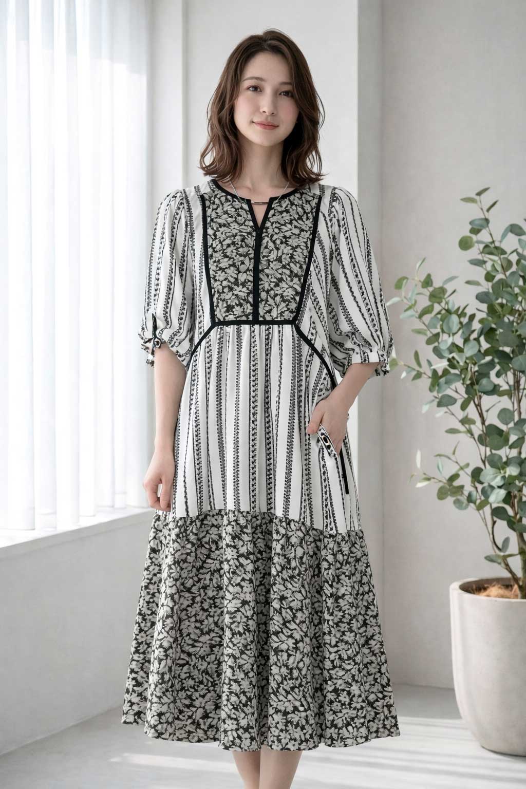 モノトーンで描く洗練。一枚で決まる大人の柄ワンピース。