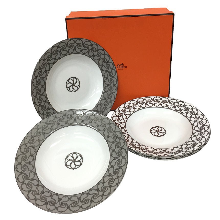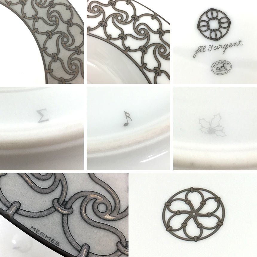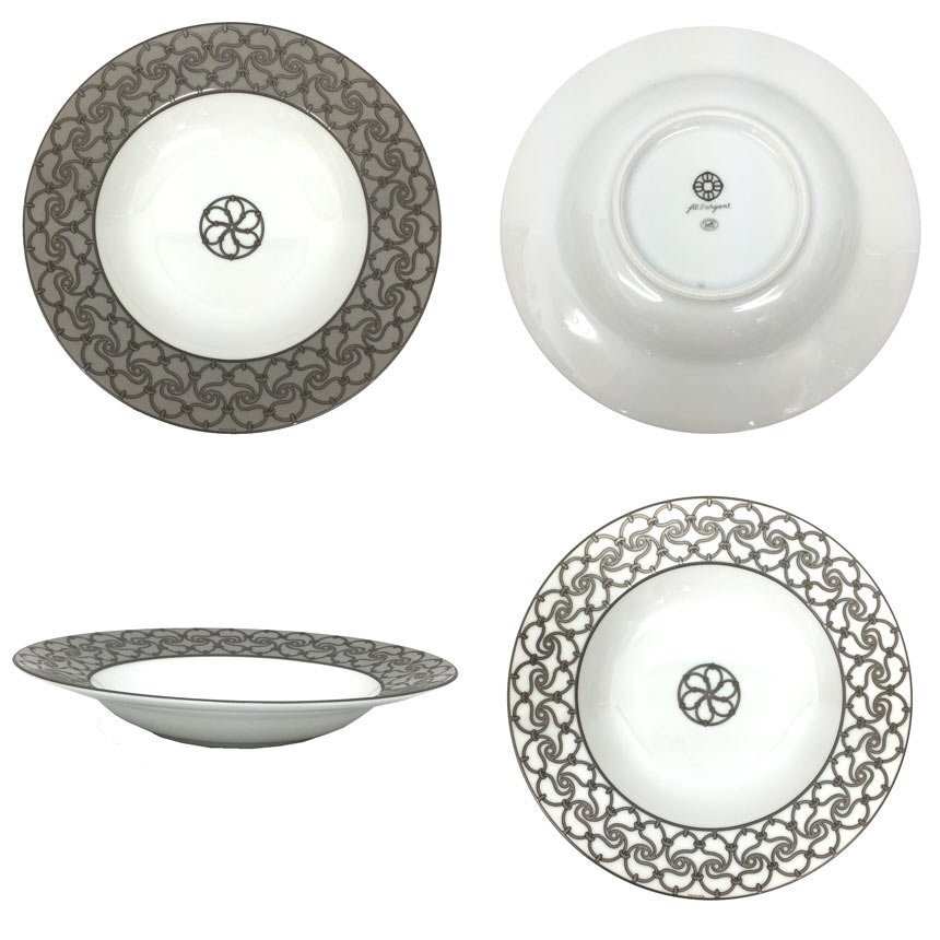 | PRコメント | エルメスより超レアものスーププレートセットが奇跡の未使用品で入荷しました! Fil d'Argent(フィルダルジャン)=銀の鎖という名の通り、鎖の模様はプラチナを溶かして使用している大変豪華なデザインです。 同じように鎖をモチーフにしたシェーヌダンクルよりも、より華やかさは特別な日の食卓にさらに彩りを添えてくれます。 こちらのスーププレートはほとんど出回っていない、大変希少なお品物です! この機会をお見逃しなく! ※金属が使用されておりますので、電子レンジでの加熱は絶対に行わないでください。 |