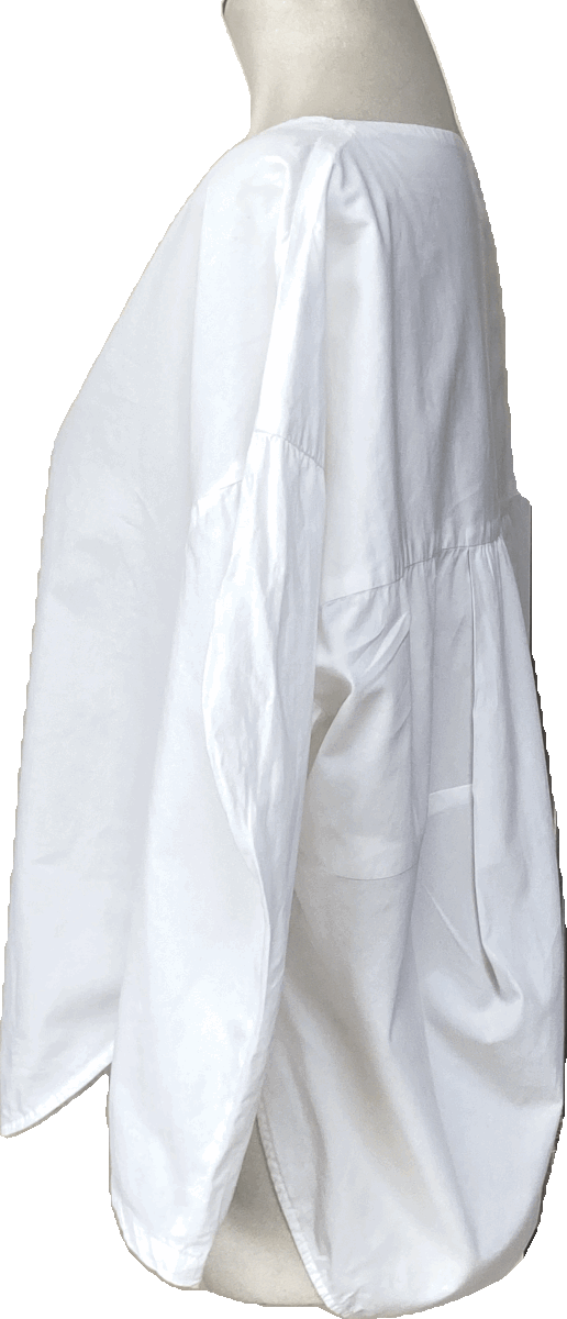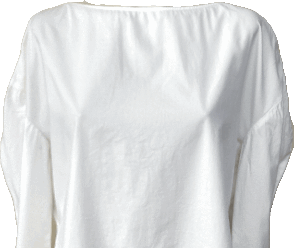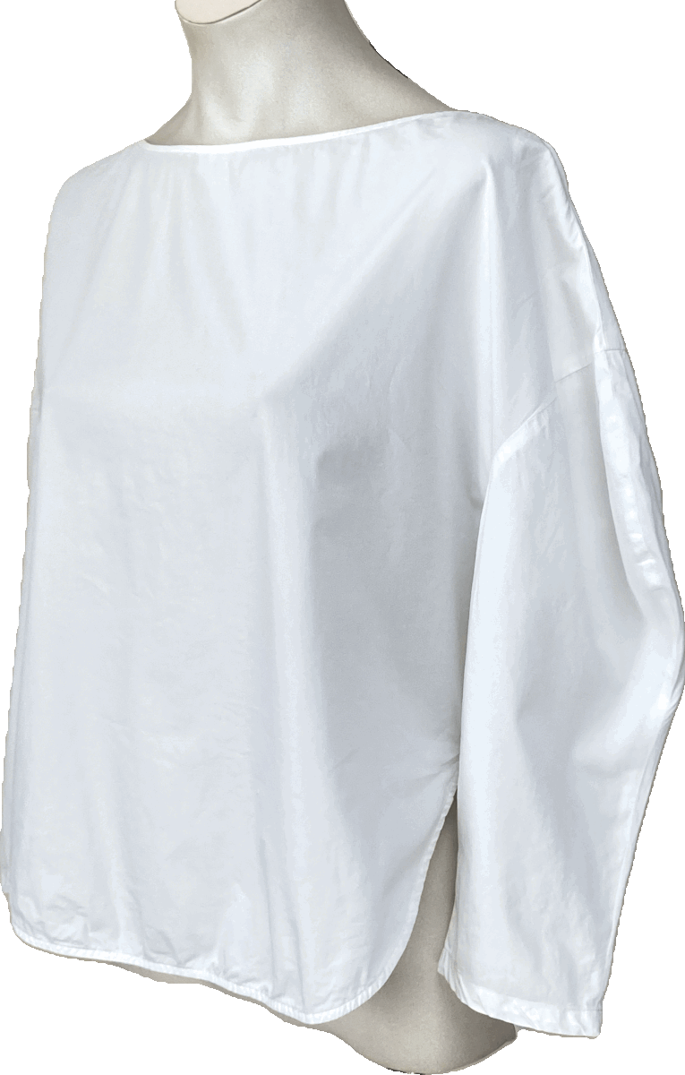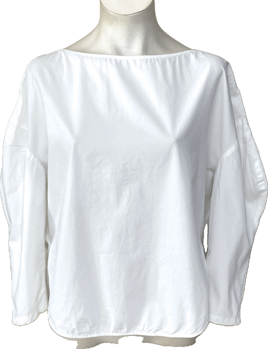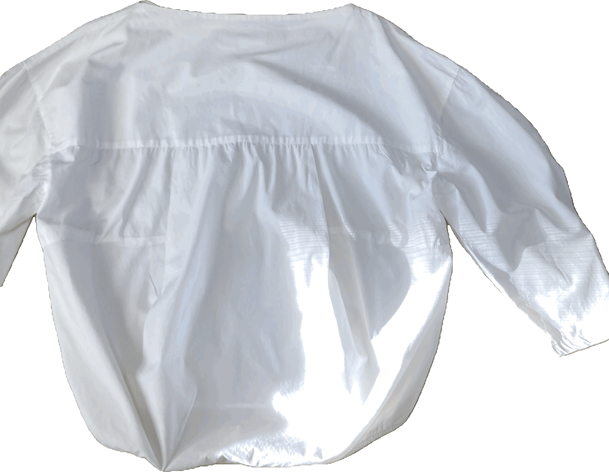 ■ボートネック、被り、ゆったり身幅でドロップショルダー、袖の肘部分を丸くカットしたデザイン袖、サイドスリットの裾ラウンドカット、後ろ裾はふっくらバルーンフィッシュテール、着やすいストレッチコットンのデザインブラウスです。