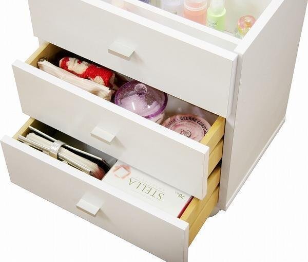 | サイズ | 全体:幅45x奥行32.5x高さ53cm 引出上段:幅38×奥行16×高さ12.5cm 引出下段:幅38×奥行24×高さ12cm 上部スペース:幅41×奥行24×高さ14cm 鏡を立ち上げた際の最大高さ:82.5cm |