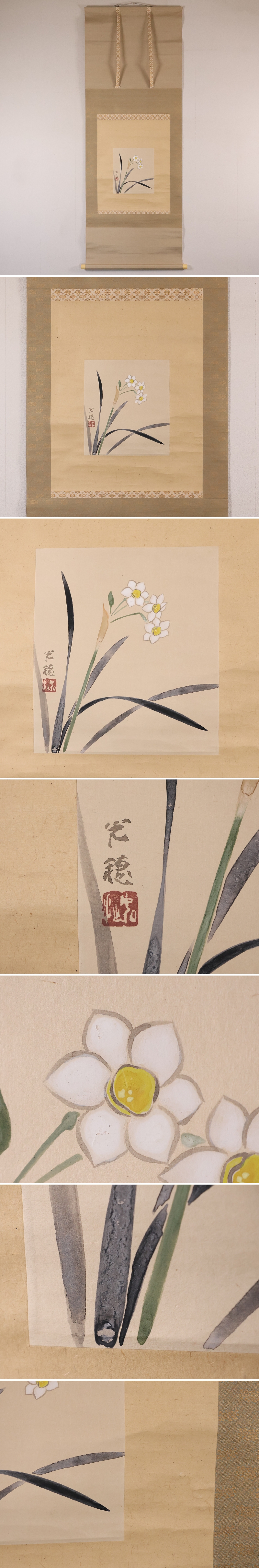 ◇【真作】日本画 佐野光穂 水仙 花図 紙本 掛軸 共箱 琳派 長野 MB249◇
