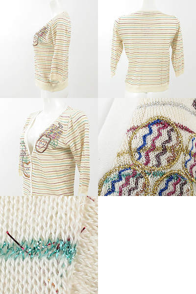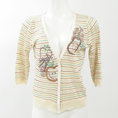 | 大人気チェスティのカーディガン♪素敵な刺繍が魅力的☆ 七分袖のカーディガンです。薄手なので暖かい季節に大活躍しますよ。異カラフルなラメボーダーとフルーツ柄の刺繍がキュート☆ Vネックなのでキャミソールなどのインナーなどをちらりと見せて コーディネートしてみて下さい♪ 素材の特性上、裾部分に少しヨレが見られます。 左首元に小さな引っ掻き傷が内側にみられますが外側はきれいな状態です。 着丈約56㎝ 袖丈約38㎝ 肩幅約32㎝ バスト約86㎝ 【サイズ】:(F) 【素 材】:(シルク35%・コットン35%・ポリエステル30%(刺繍部分 ポリエステル100%)) 【 色 】:(ベージュ) 【程 度】:(B) 12120514-058 391 023 | ||||