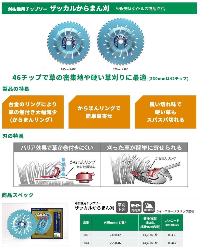 三陽金属 SANYOMETAL刈払機用チップソー ザッカルからまん刈品番:004346チップで草の密集地や硬い草刈りに最適 (230mmは42チップ)■特長・台金のリングにより草の巻付き大幅減少(からまんリング)・からまんリングで簡単草寄せ・鋭い切れ味で硬い草もスパスパ切れる■刃の特長・バリア効果で草が巻付きにくい・刈った草が簡単に寄せられる