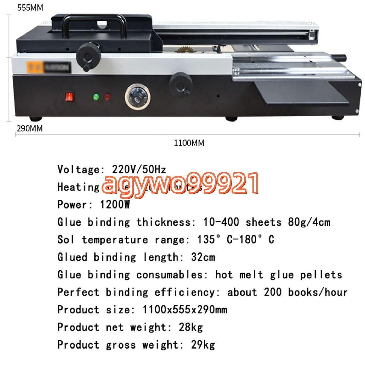 名前: 製本機 電圧: 220V/50Hz 加熱時間:20分 電力: 1200W のり製本厚さ:10~400枚 80g/4cm ゾル温度範囲: 135°C-180°C 接着綴じの長さ: 32cm 接着剤製本用品: ホットメルト接着剤ペレット 無線綴じ効率:約200冊/時間 商品サイズ:1100×555×290mm 製品正味重量: 28kg 製品総重量: 29kg