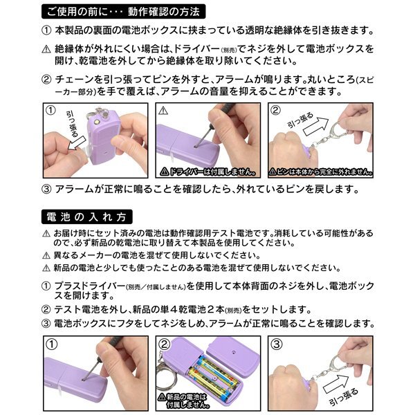※ 本製品は大音量で相手を威嚇、または周囲の人に危険を知らせることを目的とするもので、引ったくりなどの犯罪・被害を未然に防ぐものではありません。万一損害などが発生しても、当店では一切の責任を負いかねます。