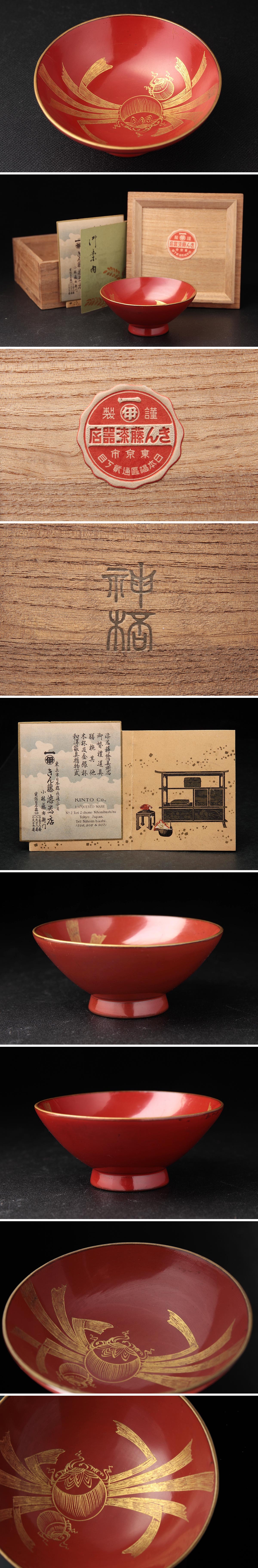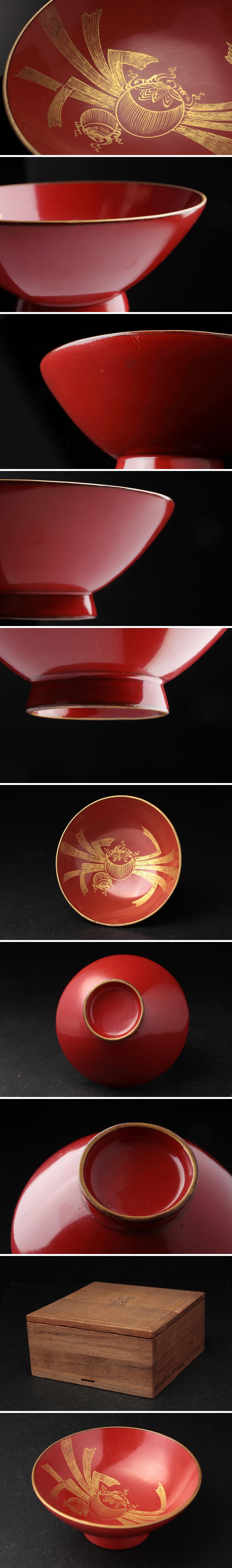 | ◆ 【きん藤漆器店 小林藤右衛門】朱漆塗 沈金 宝珠図 神盃 径8.3cm 共箱附・沈金盃・酒杯 酒器 神道道具 漆工芸 古美術 ◆