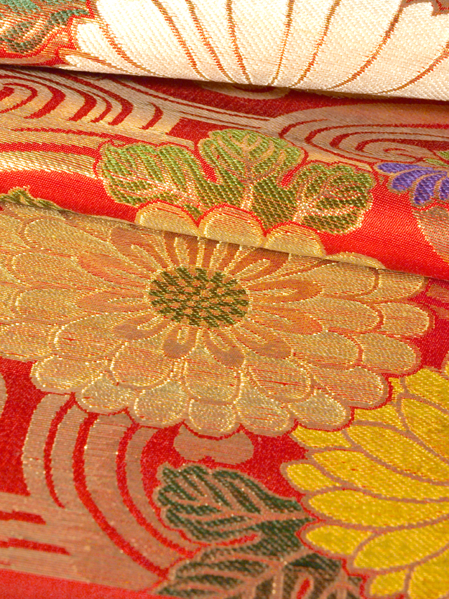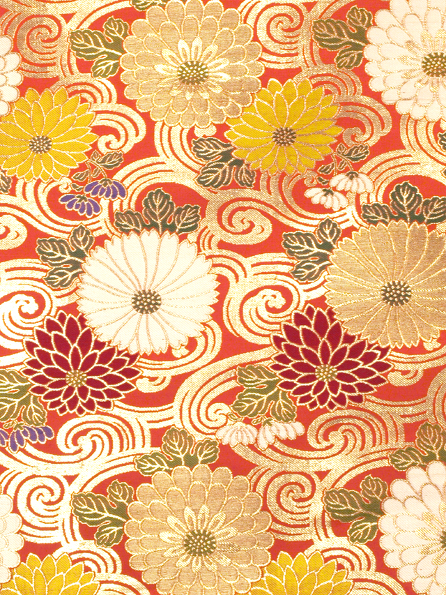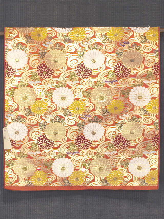 緋(ひ)色の地に、流水の地紋と菊の文様が織り込まれた、本金箔の錦織の帯地のはぎれです。丸帯の残布と思われます。 明治末から大正期ごろにつくられたと思われるアンティークのお品です。華やかなお色目と大ぶりの菊が豪奢な雰囲気です。 残布なので未使用保管品です。目につくしみやよごれ、褪色などのダメージはなく、とてもきれいな状態です。布地の力はあります。 |