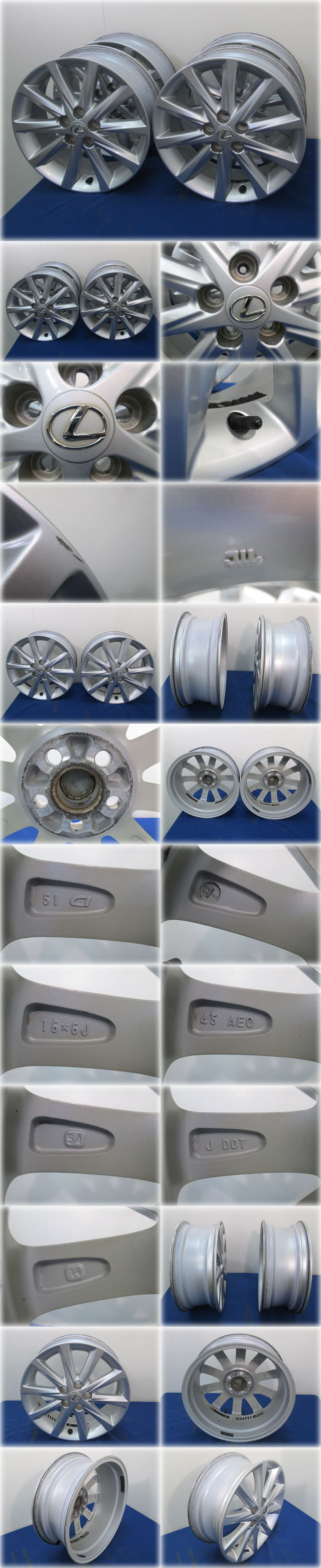 レクサス アルミホイール4枚セット レクサス CT200h バージョンC純正 を出品いたします。 ■特徴■ レクサス CT200h バージョンC純正の アルミホイール4枚セットです。 年式やグレードにより適合しない場合もございますので、 入札前にディーラーやメーカーに直接お問い合わせ下さい。 一部ガリキズなどありますが、 使用に差し支えありません。 写真に写っているものが全てのセット品です。 ナットはありません。 発送は佐川飛脚宅配便でお送りします。 別途送料が発生します。 上記「発送の注意」をご確認ください 格安出品いたしますのでこの機会をお見逃しなく! |