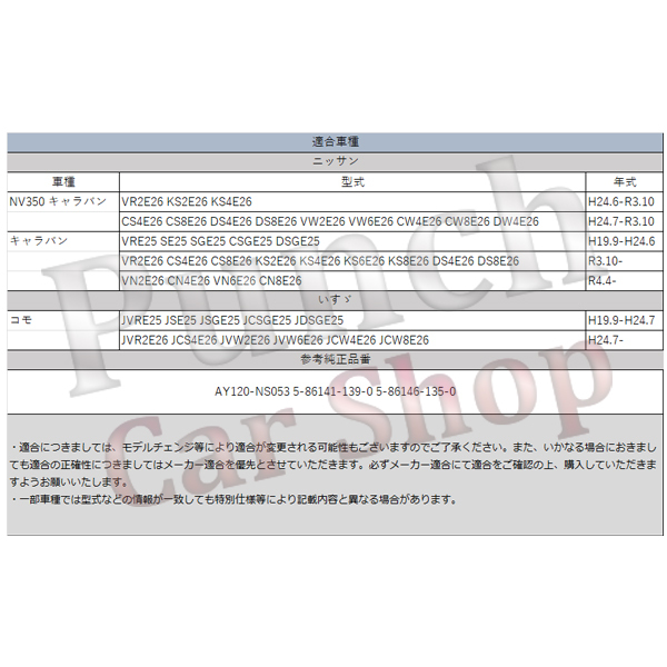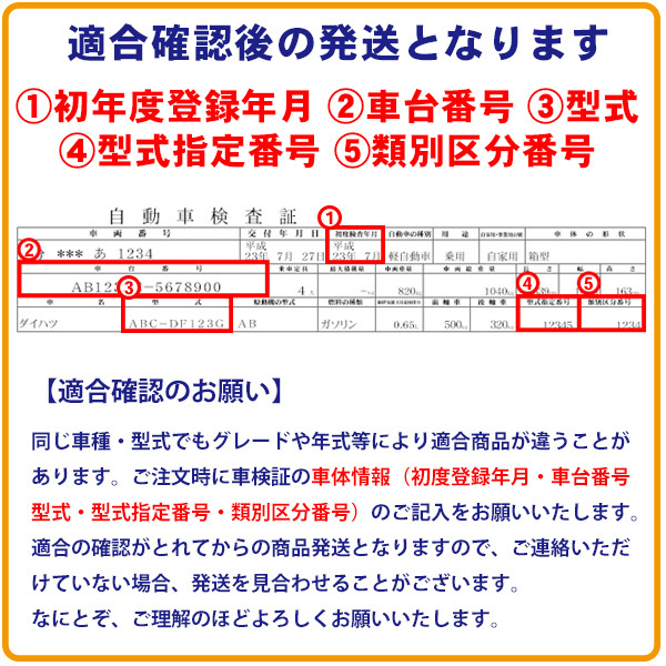 【適合確認のお願い】 商品ページに適合車種や型式を掲載しておりますが、年式やグレード等によっても適合が変わる場合がございます。 ご注文前に必ず、車体情報『初度登録年月・車台番号・型式・型式指定番号・類別区分番号』をお教えください。こちらで適合しているかをお調べいたします。 ★ご注文手続きページの『その他設定』欄に必要情報のご記入をお願い致します。商品ページに記載されている部品の『適合番号』『純正品番』にて『確認済み』とご記載ください。 適合確認の結果適合しなかった場合や、適合商品の金額が変わる場合、適合商品の在庫がない場合もございますので、必ず適合することが確定してからご注文をお願いいたします。 適合確認のご依頼がなく、商品お届け後に適合が合わなくても返品・交換できかねますのでご了承ください。 |