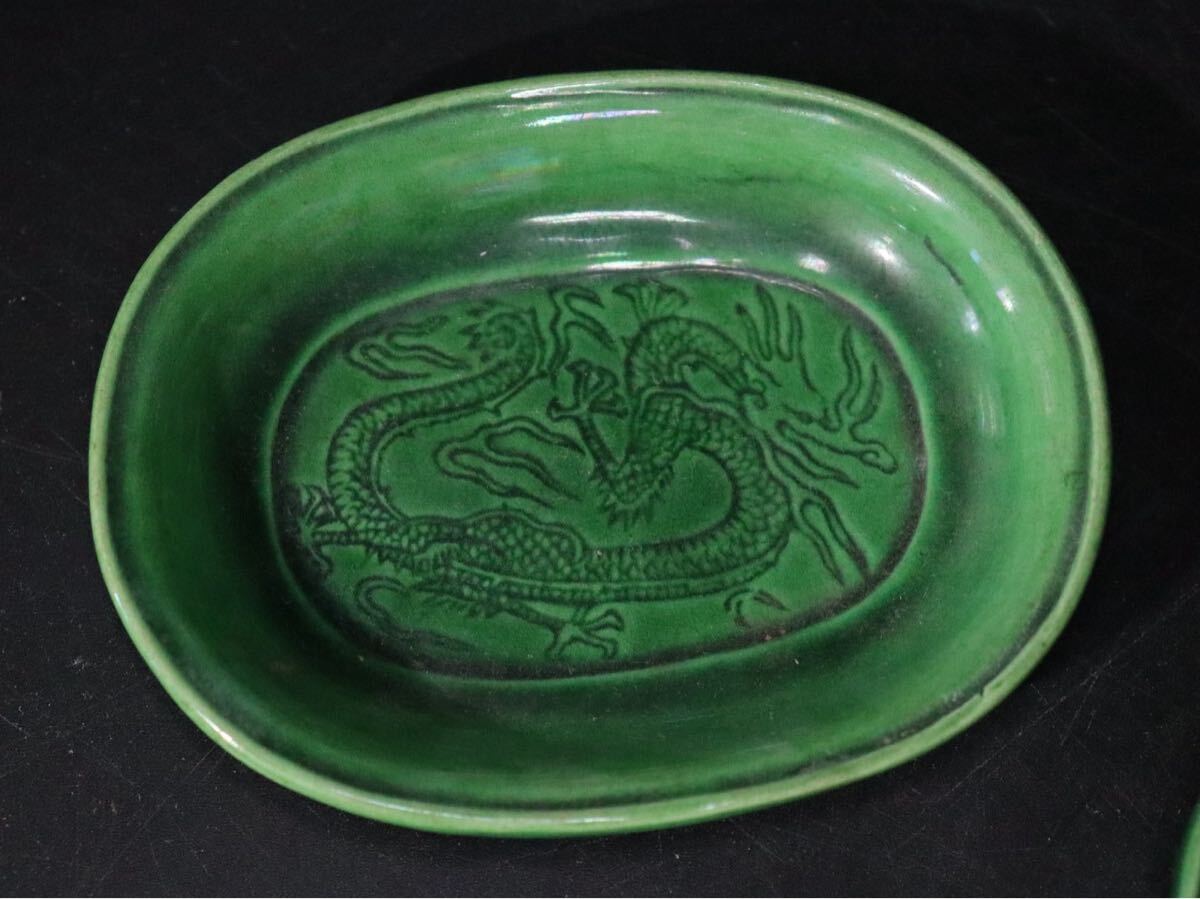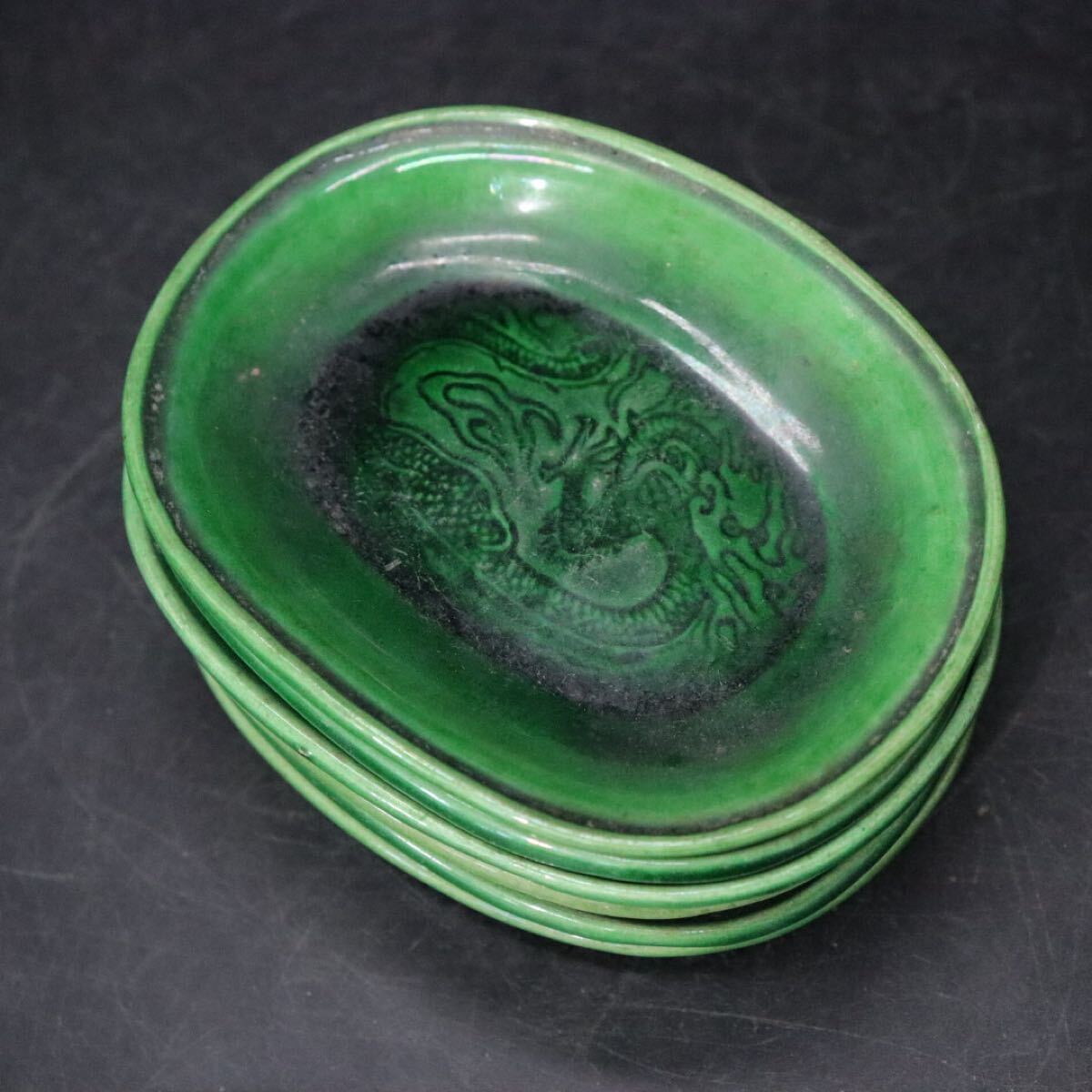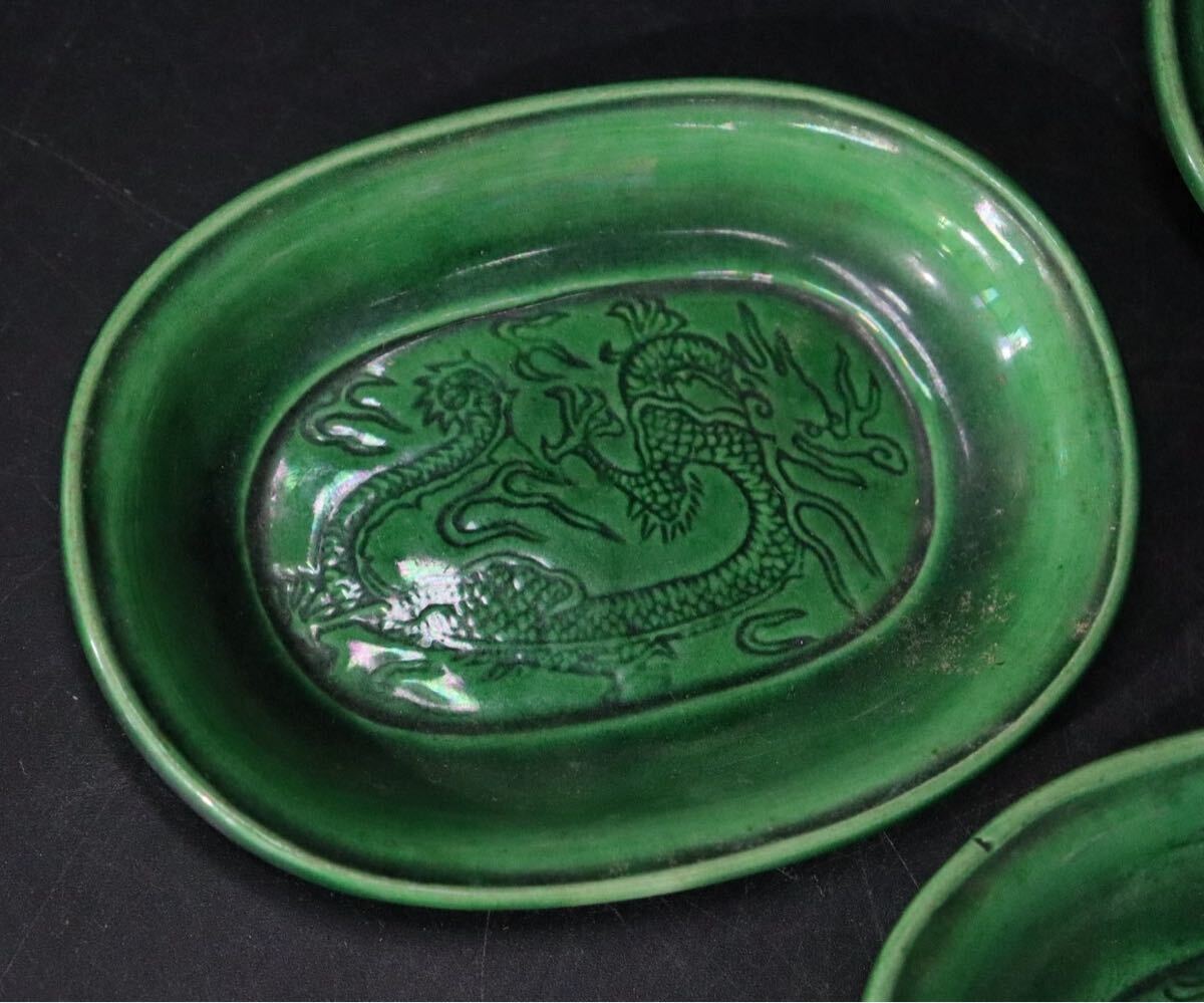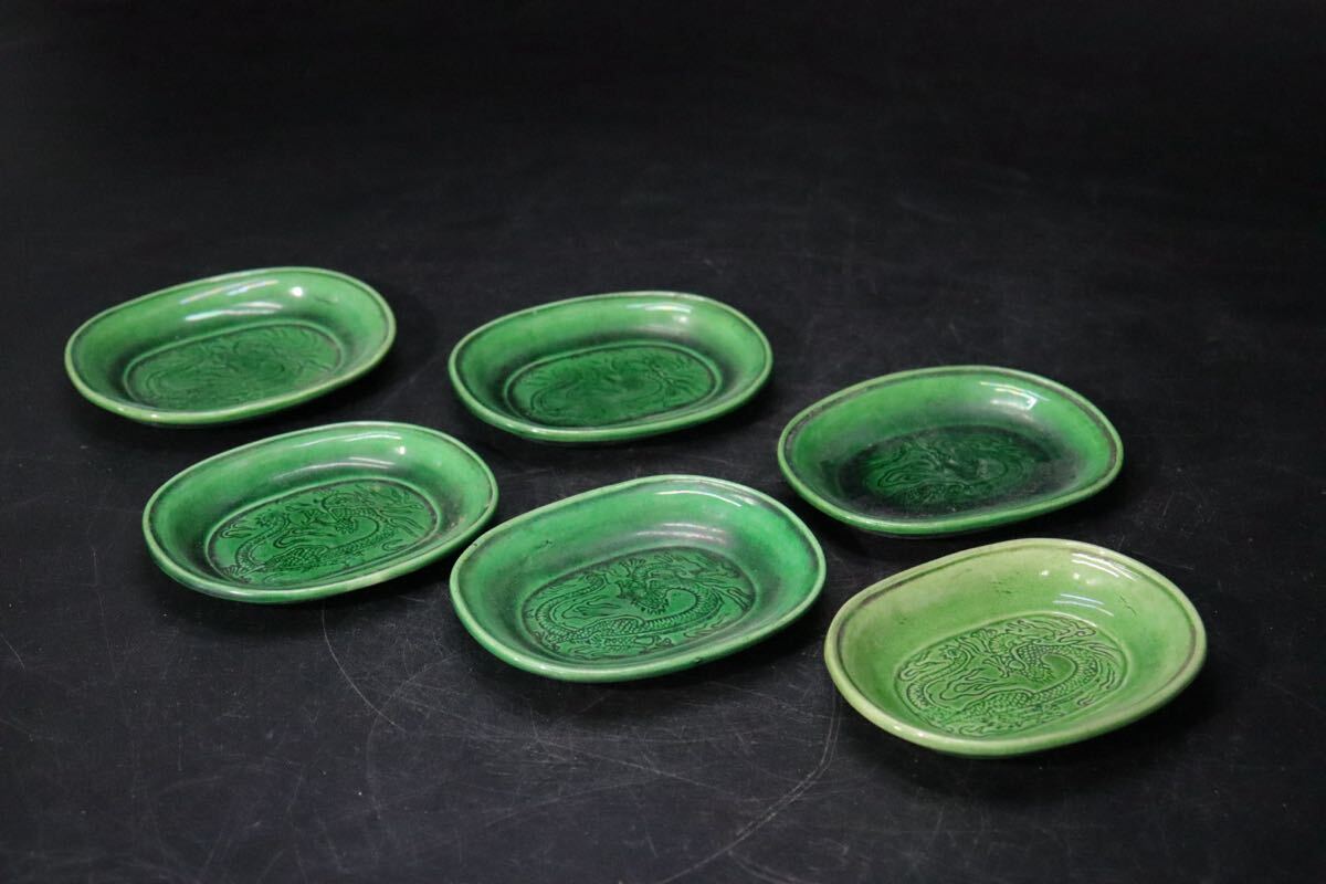 | 時代 珉平焼 緑釉 龍紋 豆皿 6客 / 茶器 煎茶道具 小皿 .B421 |