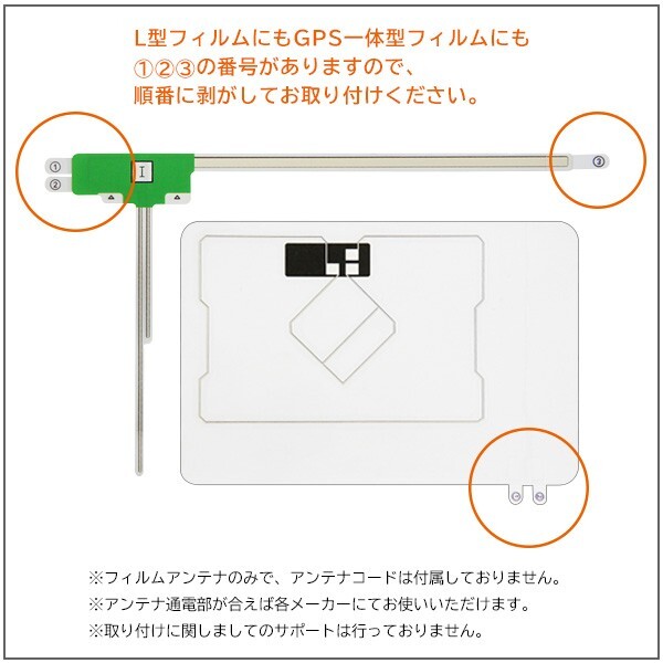 GPS一体型スクエアフィルムアンテナ 1枚 L型フィルムアンテナ 左1 枚 右2枚 3M強力両面テープMO2 MO7 4枚 ガラスクリーナー(アルコール綿)1枚 ※価格は上記セットのお値段です タイプ:L型フィルム GPS一体型フィルムアンテナ 適合:適合表をご参照ください。 状態:新品 サイズ:掲載写真をご覧ください。 |