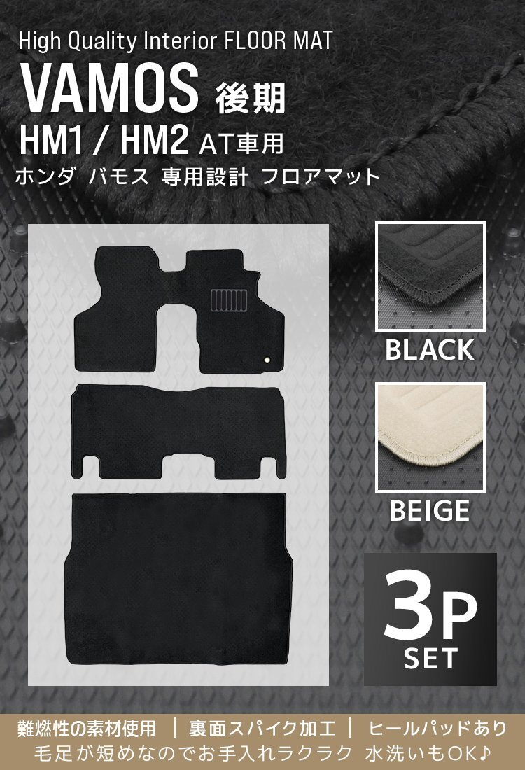 ホンダ バモス専用フロアマット3点セットです。 \おすすめポイント/ ・水洗いOK!お手入ラクラク ・表面は難燃性の素材で安心 ・短い毛足がゴミを捉えて、ホコリの舞い上がり防止 ・耐摩擦ヒールパッド付!踵部分のダメージを軽減 ・外周はオーバーロック加工で縁のほつれを防ぎます ・裏面はシリコンドット+スパイク加工でズレにくい ・運転席を固定する専用受け穴あり 【対応車種】 メーカー・車種名:ホンダ バモス 形式:HM1、HM2 グレード:AT車・後期のみ ※MT車・前期不可 適合年式:平成13年9月~平成30年5月 カラー:ベージュ 【内容】 フロントフロアマット×1、リアフロアマット×1、ラゲッジマット×1、ヒールパッド×1、固定リング×1 ※特別仕様車等には適合しないことがございますのでご購入前に形状をご確認ください。 |