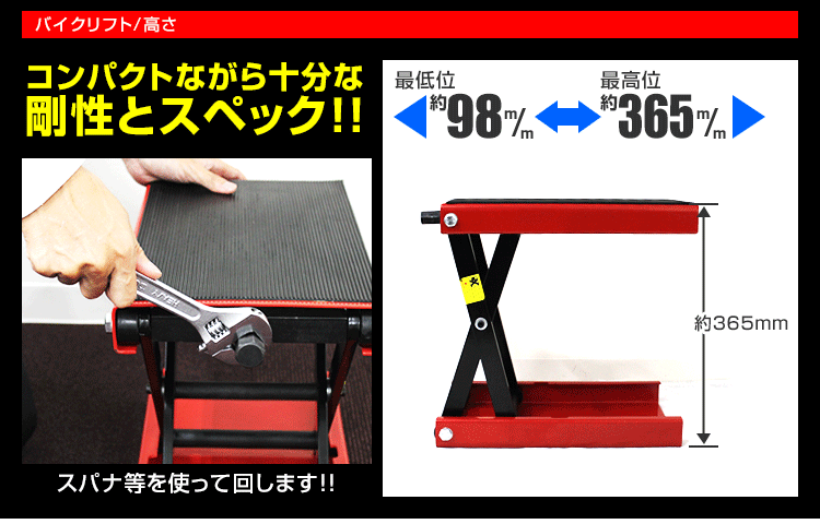 | オートバイの整備作業時などに大変便利なバイクリフトです。フロントやリア周りの整備には欠かせないアイテム!最大重量は500kgまで使えます! |