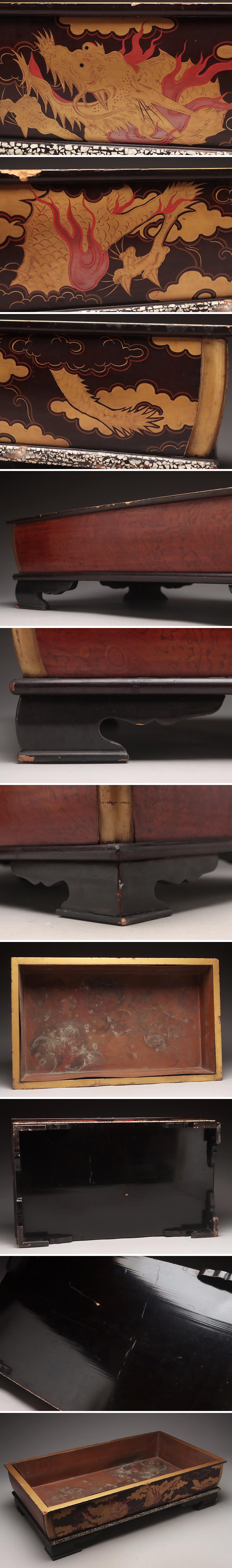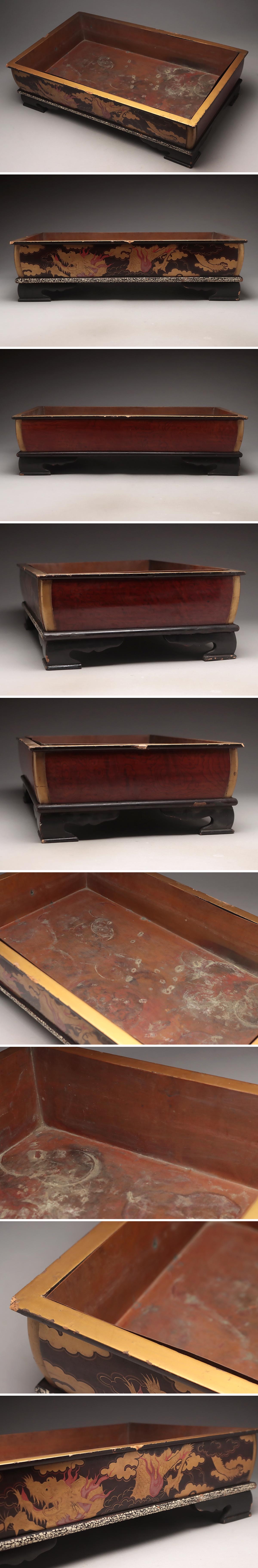 | ◆ 時代漆器 黒漆/縁卵殻塗 雲龍蒔絵 長方大水盤 銅落し付 幅58.2cm / 重3.8kg・蒔絵大水盤・砂鉢・盆景鉢 時代蒔絵 漆工芸 古美術 ◆