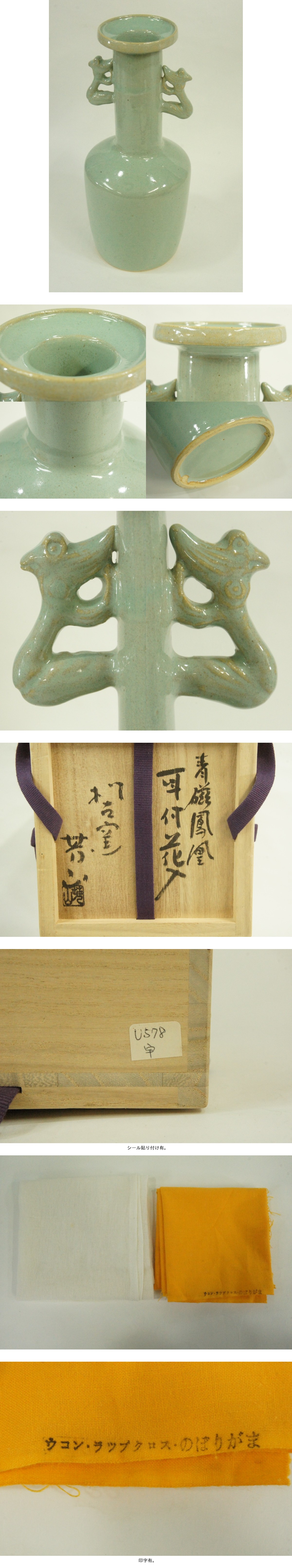 ●萬古焼 松古窯 五代佐久間芳山 青磁鳳凰耳付花入 青瓷 花瓶 花器 高さ:約27.8cm 状態良好 共箱 茶道具