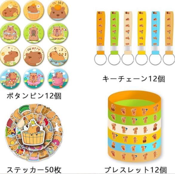 ① キーチェーン12個 ②ブレスレット12個 ③ ボタンピン12個 ④ ステッカー50枚