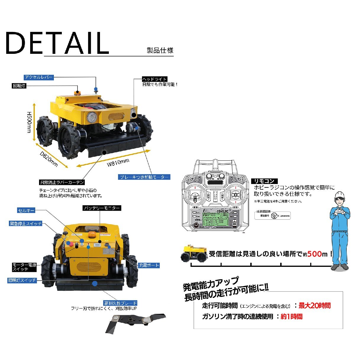 ・保管時は必ずメインブレーカーをOFFにしたうえ、 緊急停止スイッチをOFF、モーター電源スイッチをOFFにして保管してください。 スイッチがONのままだと、バッテリーが放電(電圧差が出る)ことにより、不具合が生じます。 ・目的外使用はお止めください。 ・可燃性物質、爆発物のそばで使用しないでください。 ・水中や大雨の中での使用は故障の原因となりますので、お止めください。 ・飲酒しながらや飲酒後の操作はお控えください。 ・必ず使用前に機体のそばに人や動物がいないことを確認のうえ、操作してください。 ・可燃性物質のそばや、タバコを吸いながらの給油はお止めください。 ・一酸化炭素中毒の危険性がございますので、室内使用はお止めください。 ・私有地のみ、公道などは走行できません。 ・極端にぬかるんだ地面は機体が抜け出せなくなることがございますので、大雨後などは使用をお控えください。 ・感電の恐れがありますので、バッテリー充電は雨などがかからない場所で行ってください。 ・エンジン動作中は小石や木片などが飛散する可能性がありますので、近くに立ったり、機体の底面を覗き込んだりしないでください。 ・負荷が掛かりすぎた場合、機体保護のためメインブレーカーがOFFになります。 ・燃料がなくなるまで連続使用せず、定期的に補充してください。ガス欠になるとエアーが入り、エンジンがかかりづらくなります。 ・法面作業時は、危険ですので機体の真下などに立たないでください。 保証についてはこちらをご確認ください。 |