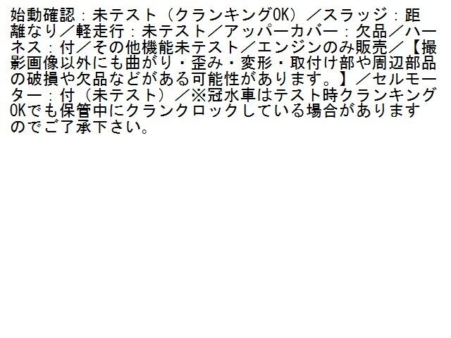 | 商品情報 | 始動確認:未テスト(クランキングOK)/スラッジ:距離なり/軽走行:未テスト/アッパーカバー:欠品/ハーネス:付/その他機能未テスト/エンジンのみ販売/【撮影画像以外にも曲がり・歪み・変形・取付け部や周辺部品の破損や欠品などがある可能性があります。】/セルモーター:付(未テスト)/※冠水車はテスト時クランキングOKでも保管中にクランクロックしている場合がありますのでご了承下さい。 | ||