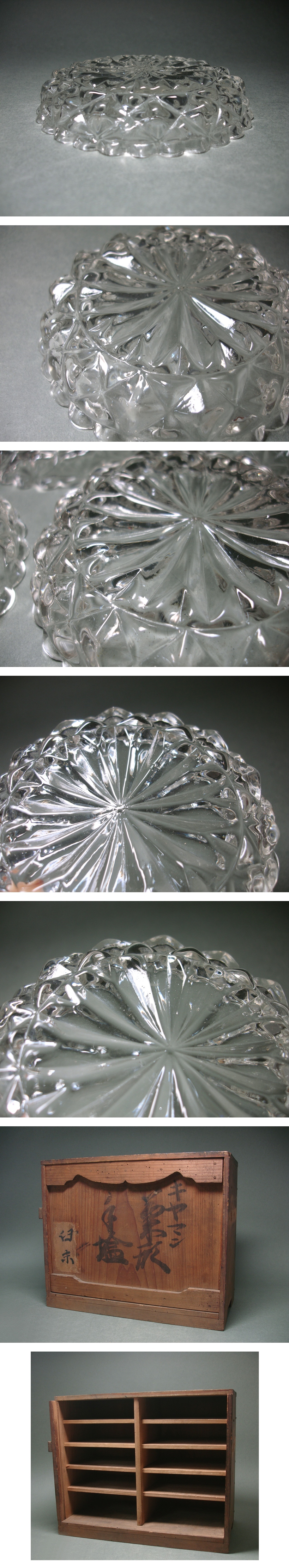 本品は、日本の幕末~明治初期の古作で、型吹き成形による厚手な透明ガラスの輪花形小皿です。       もともとは10客揃いだったようですが現状で7客となっています。        当時物の伝世時代箱入。         正真正銘本物保証!