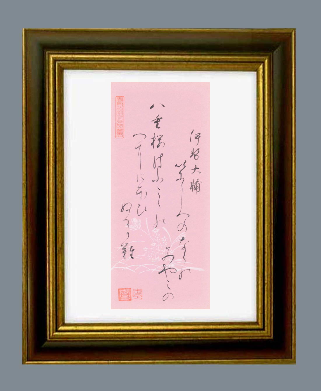 原本自筆上部には、「舟船(しゅうせん)の中に夜、琵琶を弾く者を聞く」《舟の中から夜、琵琶を奏でているのが聞こえてきた。》白楽天の元和十年(815年)江州での作。琵琶行という有名な漢詩。この漢詩は白楽天が司馬に左遷された翌年、客人を河口に見送ったおり舟の中から夜、琵琶を奏でる音が聞こえた。その音色は都会の音色である。弾いている人を尋ねてみると昔、長安の女性で琵琶の名人に学んだという。弾き終わったと、若い時の楽しかったことを語り合った。筆者の伊達孝子(たかこ)は、御三家のひとつ、江戸時代後期の大名で常陸国水戸藩の第9代藩主徳川斉昭の娘。伊達孝子(たかこ)は、八代姫(やしろひめ)として当時の徳川美人三姉妹の次女ともてはやされた。仙台藩第13代藩主・伊達慶邦の夫人として嫁いだ後も八代姫(やしろひめ)と称された。孝子(たかこ)は、和歌や漢詩の素養もある教養のある女性として知られておりますが、「百人一首」を記す際、漢詩を読み理解し共鳴していることがよくわかる。詳細な理由は下記説明欄に記載。