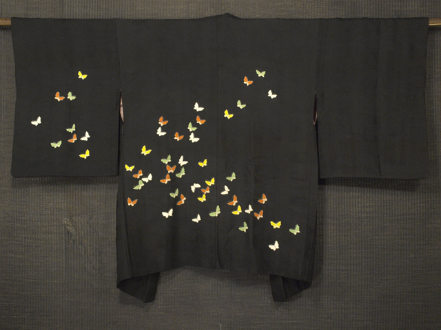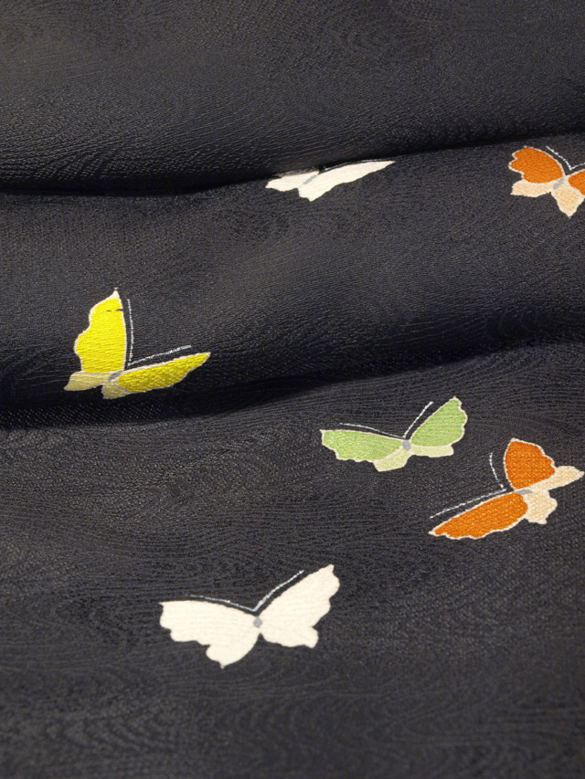 黒色の地に、流水の地紋が織り出され、蝶の文様が染められている、駒綸子の絵羽織です。袷仕立てです。 流水同様に流麗に飛翔する蝶が小粋なかわいらしさを醸しています。ややシャリ感のある駒綸子地です。 使用感はなく、未使用保管品と思われます。若干の経年感などはあるかもしれませんが 、目につくしみやよごれ、褪色などのダメージはなく、とてもきれいな状態です。 |