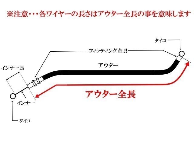 | コメント | ■ワイヤーの長さは純正長より『約30cmロング』になります ■アウター長 約136cm(多少の誤差はあります) ※アクセルワイヤーも必要な方はお得なセット商品の方を注文してくださいね |