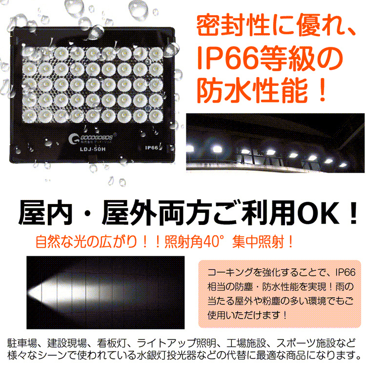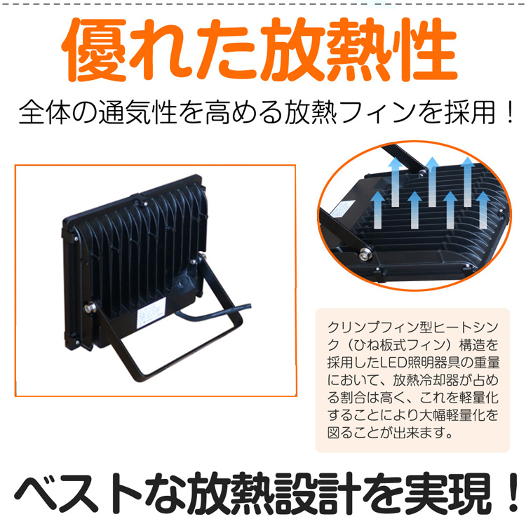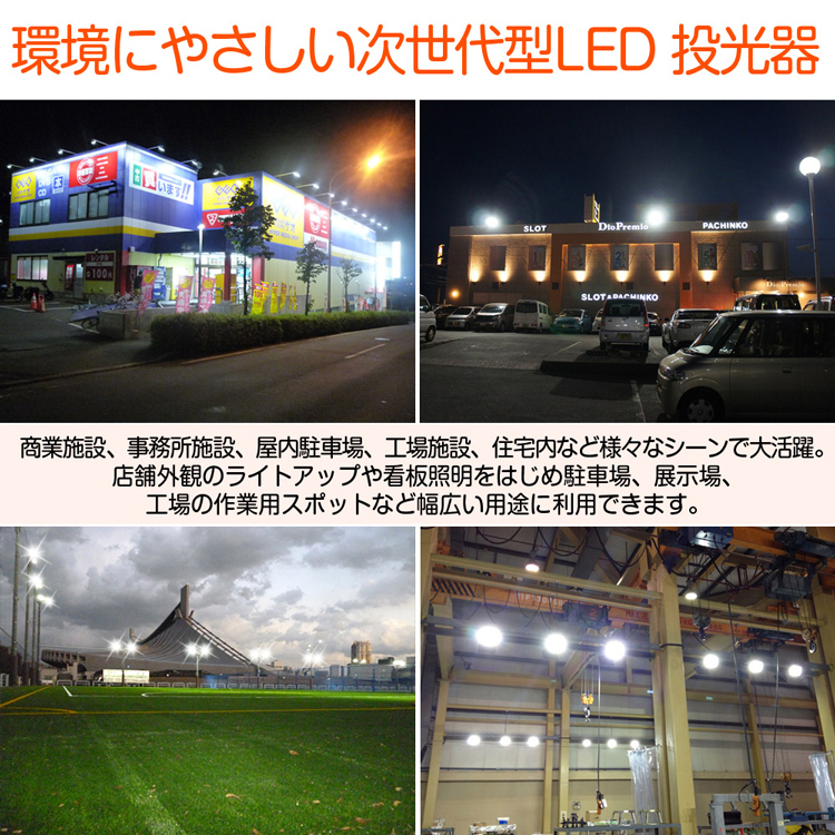 | ★オススメポイント★ 驚くほどの明るさを持つ 環境にやさしい次世代型 狭角配光のLED投光器! ●狭角40°配光設計!必要なところに必要なだけの灯りを ・高度な光学設計で効率よく光を取り出し、狭角40°配光を実現!集光性を著しく高めた! ・必要なところに必要なだけの灯りを!光漏れをカット! ・狭角配光で長距離照射可能 ●超爆光と驚く省エネ性能を両立! 超高輝度SMDチップを採用!従来LEDチップより耐熱性が高く発熱量が少ない高輝度チップを90粒搭載。 全光束最大7020lmを実現!大幅な消費電力を削減し、さらに明るもにアップしています! ●優れた放熱性 ボディーはアルミ製で強度も強く背面は放熱性に優れたフィン形状になっていますので高熱によるLED劣化を防ぎます。 ●革新!LED投光器がコンパクトになりました!薄さ40mmの「極薄型LED投光器」! LED投光器と聞けば【重くて大きい】というイメージを持たれますが、本製品はイメージを覆す程【薄くて軽い!】小型化に成功した製品です。駆動回路の小型化に専念し、遂にタブレット並みのコンパクトサイズを実現しました! 新設計の薄型ボディで従来の商品よりも設置場所が広がります! ●密封性に優れ、IP66等級の防水性能を! コーキングを強化することで、IP66相当の防塵・防水性能を実現!雨の当たる屋外や粉塵の多い環境でもご使用いただけます! 用途 駐車場、建設現場、看板灯、ライトアップ照明、工場施設、スポーツ施設など 様々なシーンで使われている水銀灯投光器などの代替に最適な商品になります。 商業施設、事務所施設、屋内駐車場、工場施設、住宅内など様々なシーンで大活躍。 店舗外観のライトアップや看板照明をはじめ駐車場、展示場、工場の作業用スポットなど幅広い用途に利用できます。 |