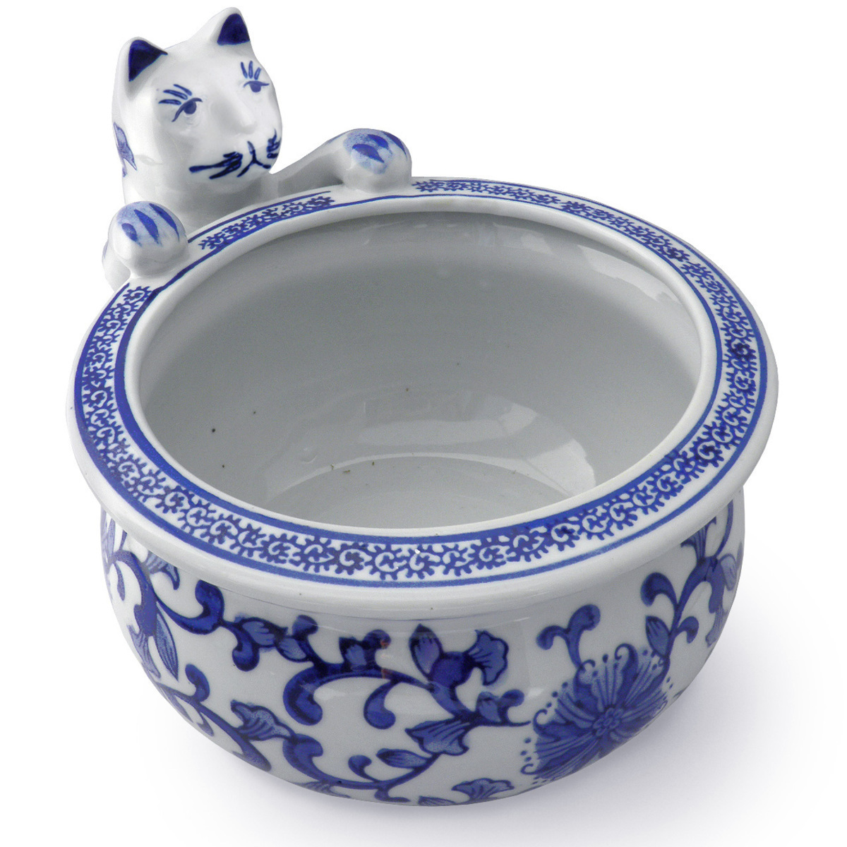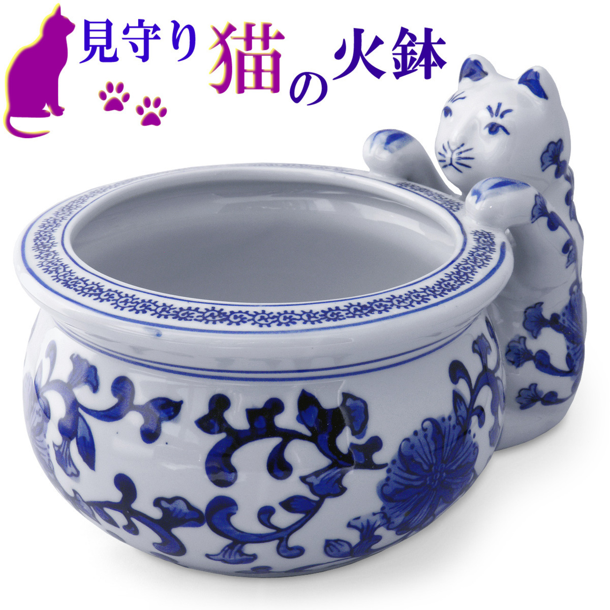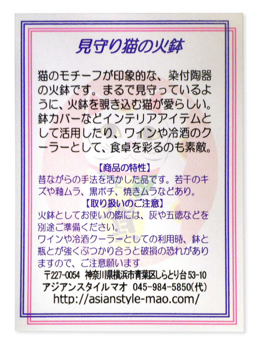 猫のモチーフが印象的な、染付陶器の火鉢・水鉢です。 手あぶりサイズの小ぶりな鉢なので、実用よりインテリアアイテムとしてお使いいただくのがお薦め。 鉢カバーとして観葉植物や花鉢を飾っても可愛いし、上から眺めて楽しむ金魚鉢として使うのも良し。 ワインや冷酒のクーラーとして、食卓を彩るのも素敵です。 アンティーク(骨董)風の趣きある品なので、和室にはもちろん洋室のインテリアアクセントとしても、引き立つこと間違いなしです。 ▼サイズ 横幅最大25cm×高さ最大16cm、火鉢直径約17.5cm×高さ約10.5cm ※手作りの為、品ごとに若干の違いあり。 ▼素材・仕様 染付け陶器、オリジナル説明書付き ※商品本体以外の品は撮影用の小道具で、出品物には含まれません。 ▼商品の特性 昔ながらの手法を活かした品です。 釉ムラ、印判ズレ、滲み、カスレ、黒ポチ、ピンホールやブクといった焼成時に発生する窯傷等のある場合がございます。 素朴な手作り品ならではの味わい・特性としてご理解いただけますよう、お願い申し上げます。 ▼取り扱い上のご注意 火鉢としてお使いの際は、灰や五徳など別途ご用意ください(当店では扱っておりません)。 室内で炭をお使いになる際は換気に注意し、火の始末にはくれぐれもご注意願います。 ワインや冷酒のクーラーとしてご利用の際、鉢と酒瓶が強くぶつかりあうと破損の恐れがございますので、ご注意ください。 |