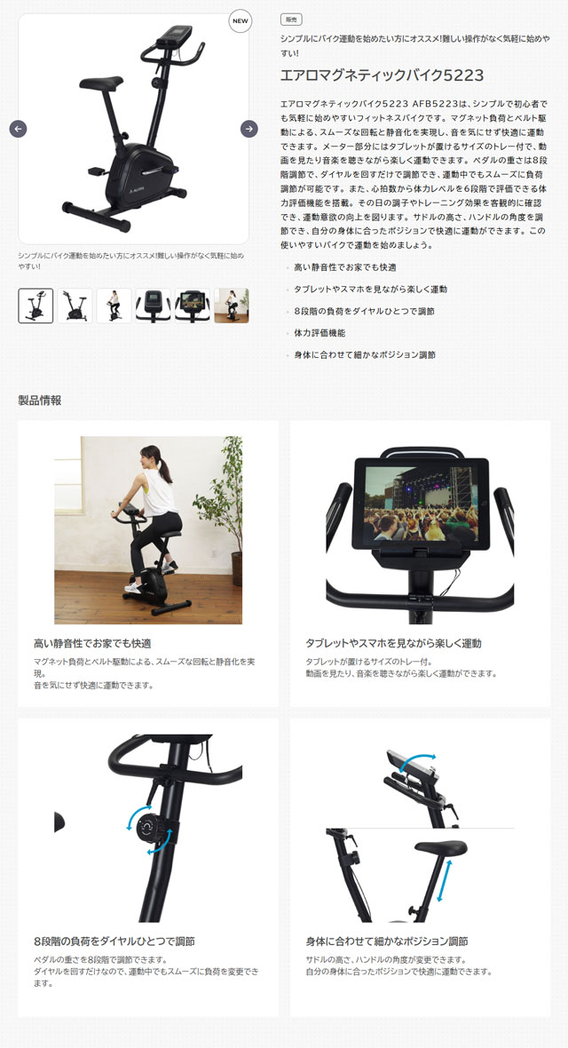 アルインコ エアロマグネティックバイク AFB5223 を出品いたします。 ■特徴■ シンプルにバイク運動を始めたい方にオススメ! 難しい操作がなく気軽に始めやすい! エアロマグネティックバイク5223 AFB5223は、 シンプルで初心者でも気軽に始めやすい フィットネスバイクです。 マグネット負荷とベルト駆動による、 スムーズな回転と静音化を実現し、 音を気にせず快適に運動できます。 メーター部分にはタブレットが置けるサイズのトレー付で、 動画を見たり音楽を聴きながら楽しく運動できます。 ペダルの重さは8段階調節で、 ダイヤルを回すだけで調節でき、 運動中でもスムーズに負荷調節が可能です。 また、心拍数から体力レベルを 6段階で評価できる体力評価機能を搭載。 その日の調子やトレーニング効果を客観的に確認でき、 運動意欲の向上を図ります。 サドルの高さ、ハンドルの角度を調節でき、 自分の身体に合ったポジションで快適に運動ができます。 この使いやすいバイクで運動を始めましょう。 高い静音性でお家でも快適 マグネット負荷とベルト駆動による、 スムーズな回転と静音化を実現。 音を気にせず快適に運動できます。 タブレットやスマホを見ながら楽しく運動 タブレットが置けるサイズのトレー付。 動画を見たり、音楽を聴きながら 楽しく運動ができます。 8段階の負荷をダイヤルひとつで調節 ペダルの重さを8段階で調節できます。 ダイヤルを回すだけなので、 運動中でもスムーズに負荷を変更できます。 身体に合わせて細かなポジション調節 サドルの高さ、ハンドルの角度が変更できます。 自分の身体に合ったポジションで 快適に運動できます。 ■仕様■