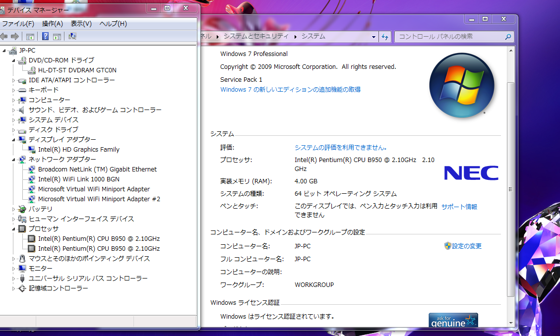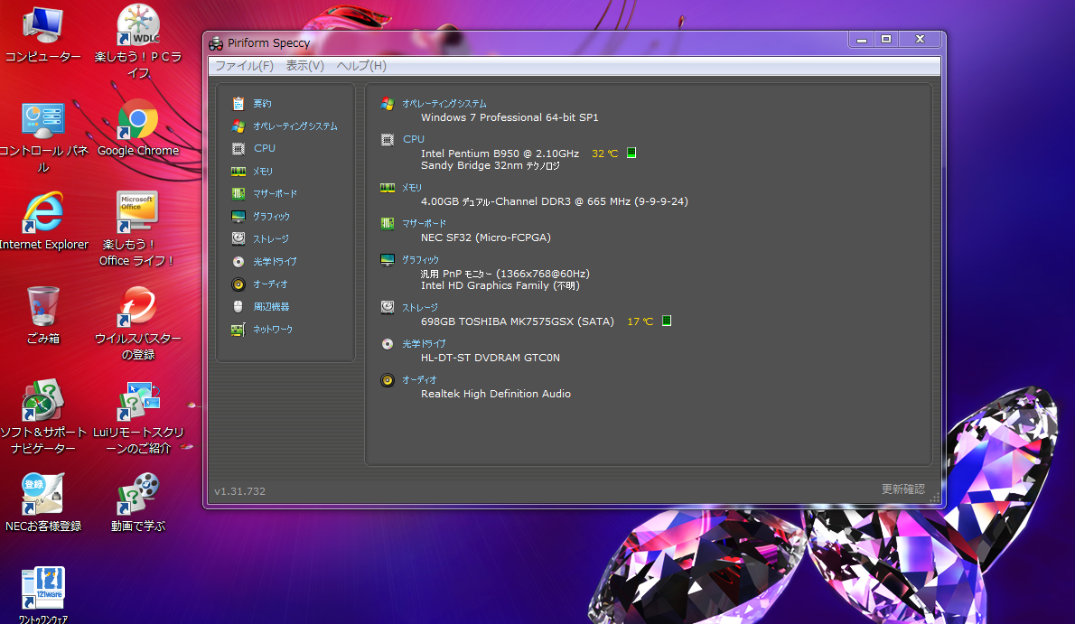 ストレージ(HDD) | 750GB HDD ソフトでチェック済--正常 Windows 7 Professional 64bit リカバリー領域あり (簡単に再セットアップが可能です)。 トラブル時に工場出荷時への復元もでき安心してお使いできます 。 SSDへの変更をおすすめします。 HDDに比べると起動やファイルの読み書きが大幅に高速になるだけでなく、 省電力、軽量、耐ショック性、低発熱のメリットがあります。 |