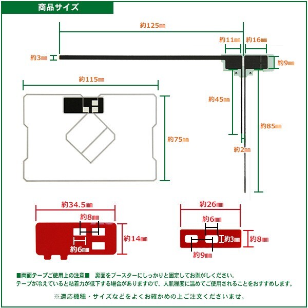 GPS一体型スクエアフィルムアンテナ 1枚 L型フィルムアンテナ 左1 枚 右2枚 3M強力両面テープMO2 MO7 4枚 ガラスクリーナー(アルコール綿)1枚 ※価格は上記セットのお値段です タイプ:L型フィルム GPS一体型フィルムアンテナ 適合:適合表をご参照ください。 状態:新品 サイズ:掲載写真をご覧ください。 |