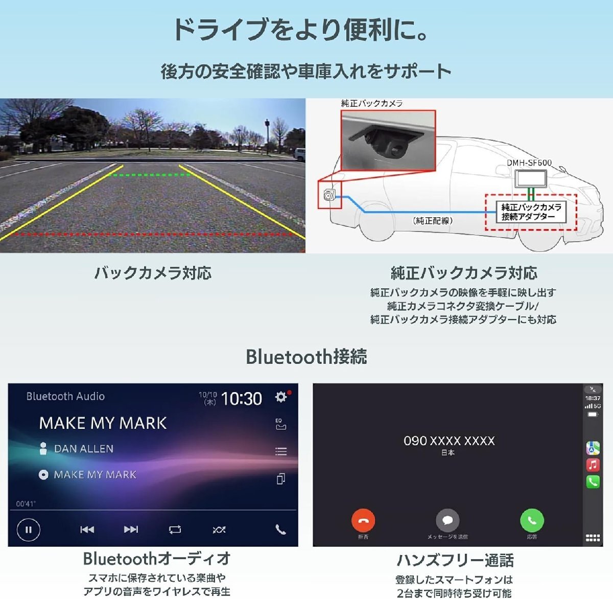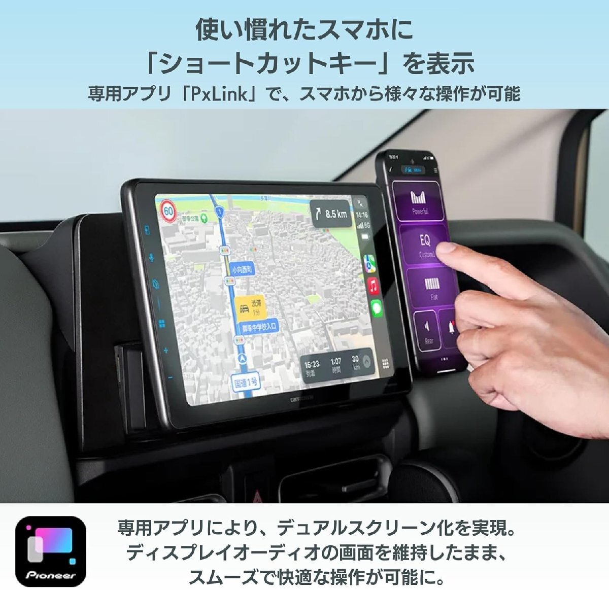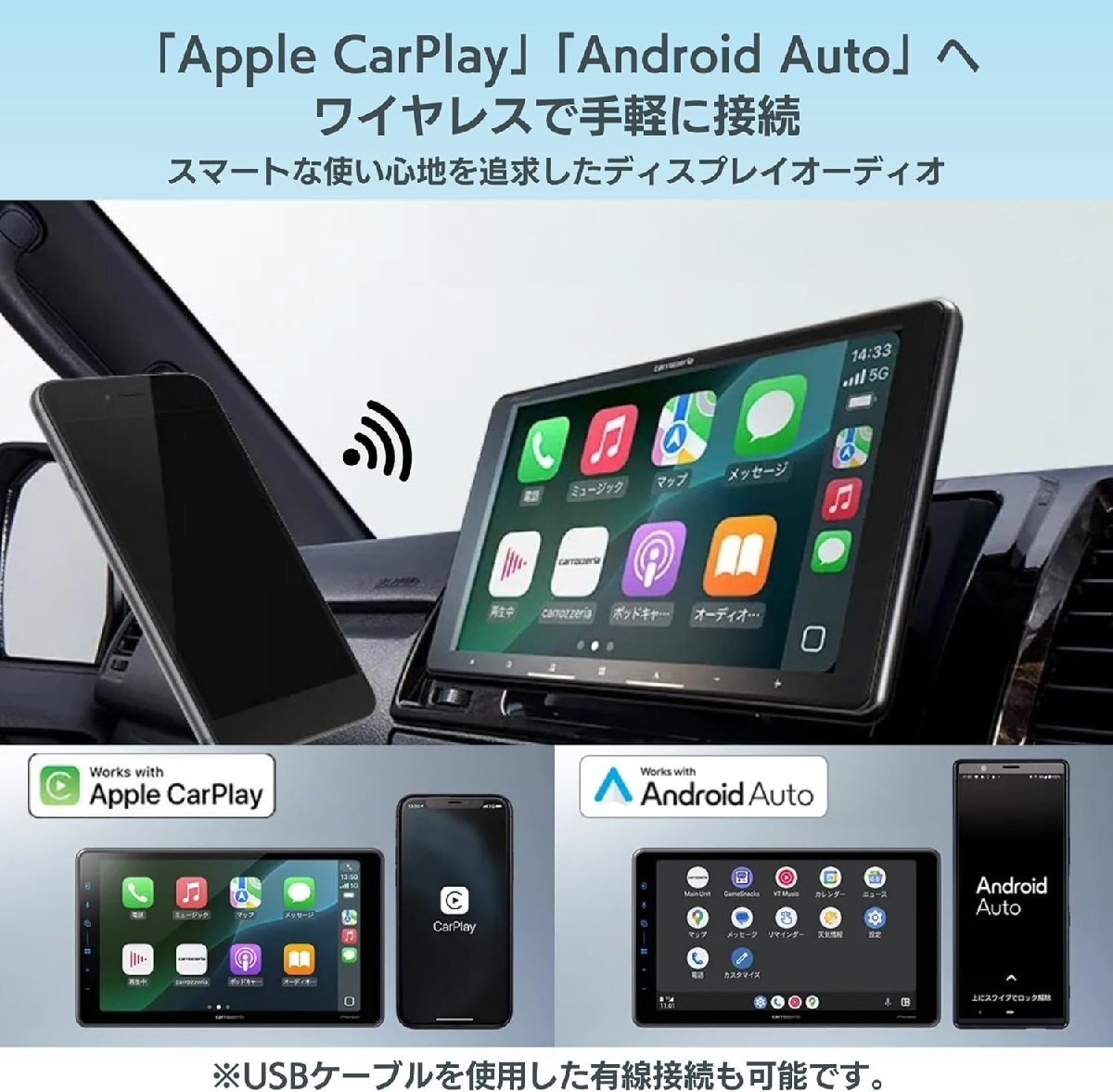 「Apple CarPlay」「Android Auto〓」にワイヤレスで接続。新インターフェースの使いやすさとエンタメの迫力を大画面で楽しめるあなたのスマートフォンと連携し、いつものドライブが「使いやすさ」と「楽しさ」を両立した快適なドライブへ。ワイヤレスでつながる「Apple CarPlay」「Android Auto」だけでなく、スマホ連携専用アプリ「PxLink」をはじめとする、よりスムーズで快適な使い心地を追求したインターフェース、大迫力映像を満喫できる9インチフローティング大画面、さらには、こだわり抜いた高音質パーツの採用と精緻な調整能力に裏付けられた、クラスを超える高音質など。単なる移動時間やいつもの車室内空間の質をガラリと変えるいくつもの考え抜かれた機能が、あなたのドライブする気持ちをさらに高めます。便利があふれ、ワクワクがとまらない、これまで経験したことのない感動のドライブ体験へ。USBケーブルを使用した有線接続も可能です。