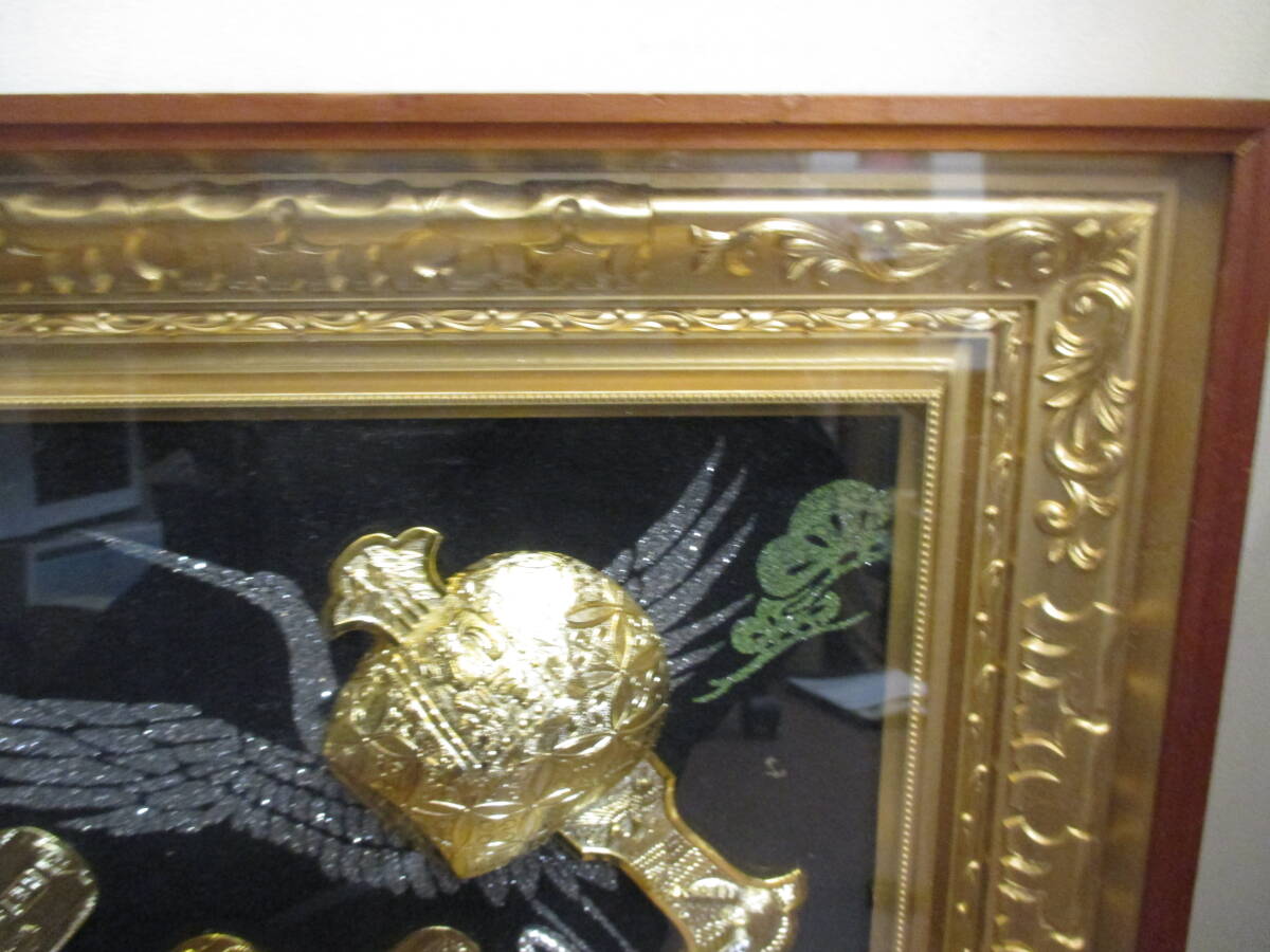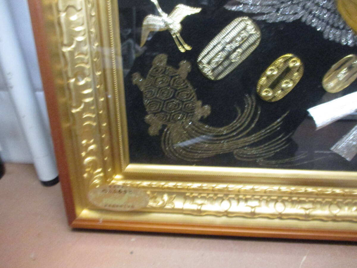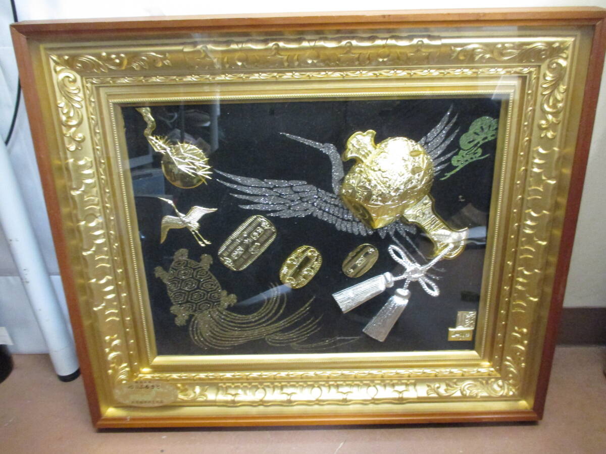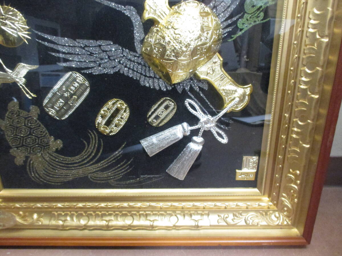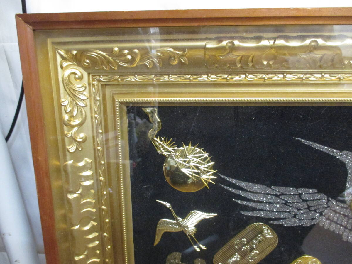 | ★#41064 【長期保管品】純金純銀鍍金 絵画 縁起物 松庵 打ち出の小槌 鶴 小判 額装 インテリア 昭和レトロ 美術品 | ||